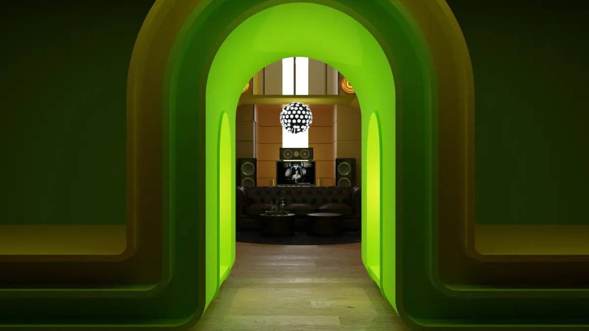 This is a KTV where vintage charm meets modern style, and stepping inside feels like entering another era. Dim lighting casts a glow on neon signs along the walls, while retro leather sofas are neatly arranged, exuding a blend of classic allure and contemporary coolness. The walls are adorned with vinyl records and old movie posters, evoking a sense of nostalgia, yet every detail carries a modern design touch. The microphones glimmer faintly, and the smooth black marble floor at the center stage reflects colorful lights, creating an atmosphere that's both luxurious and inviting. The sound system is top-notch, with voices resonating clearly and richly throughout the room. Every corner tells you this is a place where past and future collide, allowing you to immerse yourself in music and laughter, for a truly unique night.optimized with178,025 vertices, 425,156 edges and 249,011 faces.