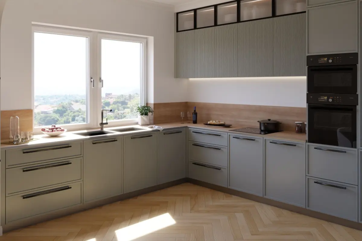 Modern L-shape Kitchen in grey laminate finish, black handle, timber benchtop and splashback.