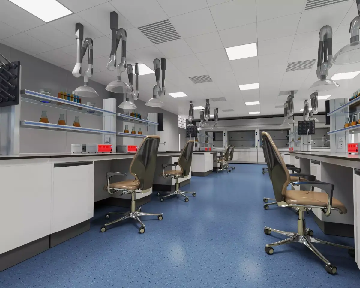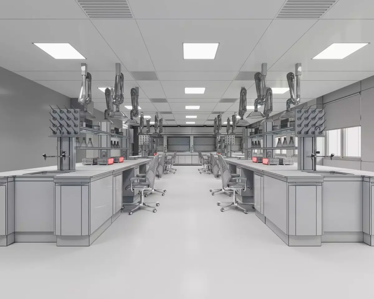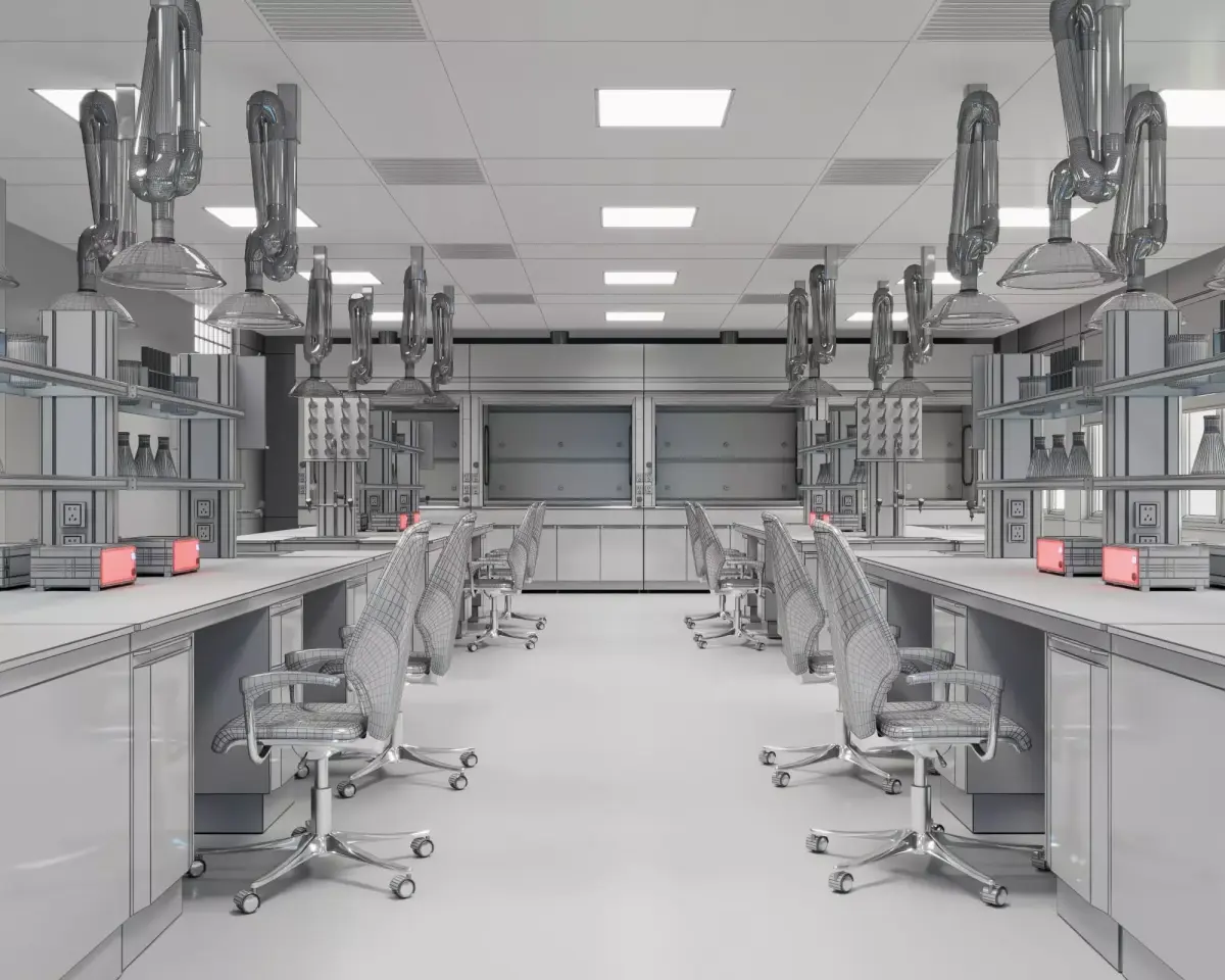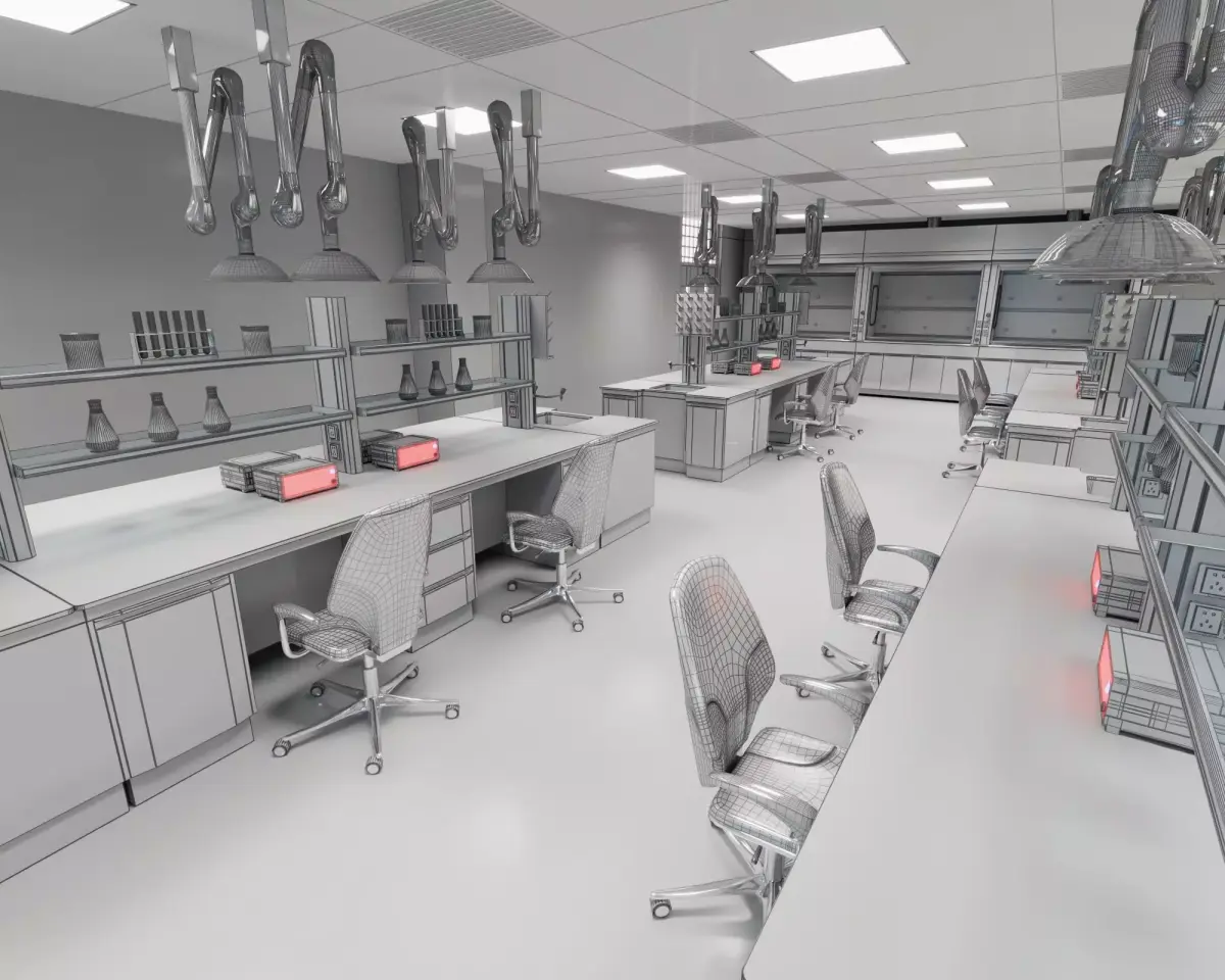 This highly detailed 3D model represents a spacious, professional chemistry or school science laboratory featuring symmetrical island benches with black countertops, multiple overhead fume hoods with flexible extraction arms, drying racks, sinks, reagent shelves with colorful bottles and flasks, ergonomic brown leather chairs, bright recessed ceiling lighting, blue epoxy flooring, white cabinetry, and large windows with blinds. The clean, organized layout is perfect for educational, research, or industrial lab visualizations. Ideal for architectural renders, animations, VR training modules, scientific simulations, or game environments. Built with clean topology, realistic materials, and optimized for high-quality rendering.