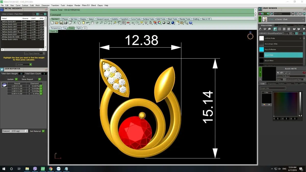 Rendered images include full dimensions, gemstone sizes, volume, and estimated metal weight for efficient customization and production.