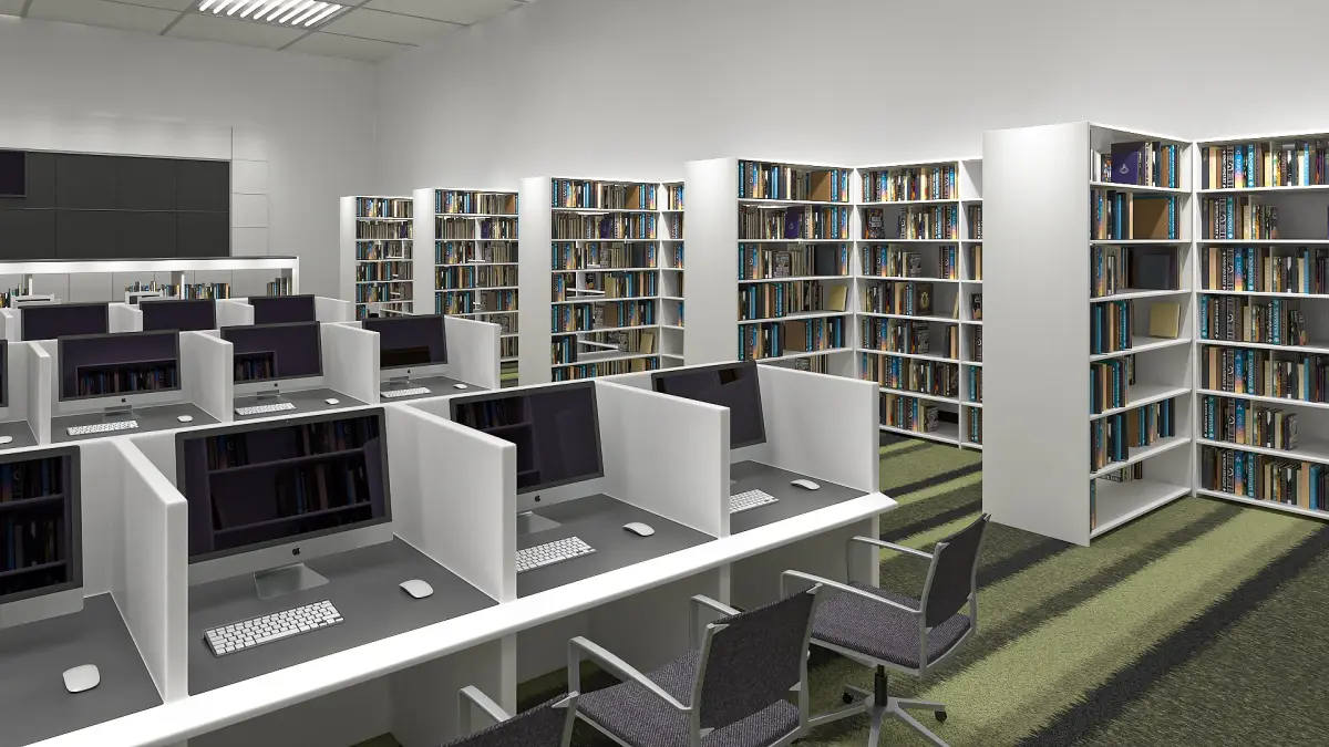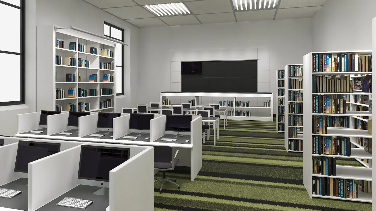 Modern Library Interior is a three-dimensional model of modern library interior that blends functionality with style, featuring open spaces, special furniture, computer workspaces and books.