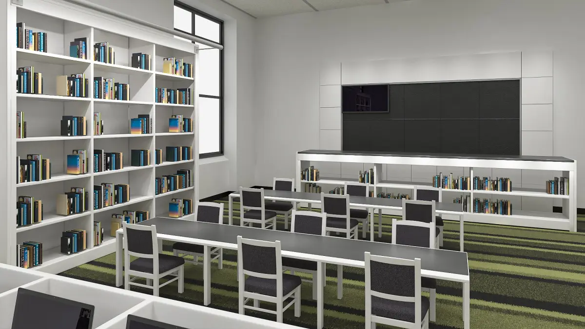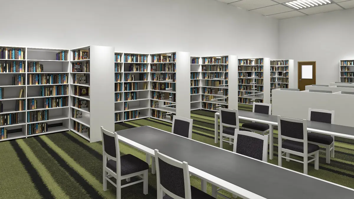 A modern library interior balances traditional elements with contemporary design. Books are displayed on streamlined shelving, while tables and chairs cater to individual and group needs. The reception desk serves as a welcoming hub, and ergonomic furniture ensures comfort. This approach creates an inspiring space for learning and connection.