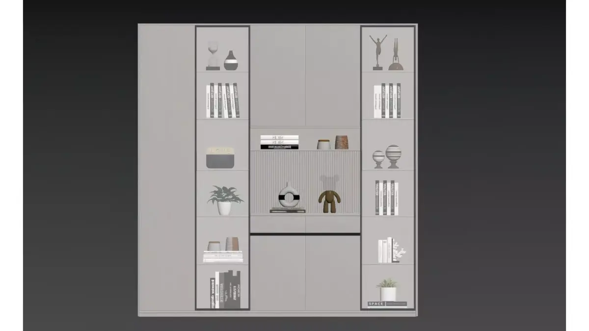 This is a set of modern light luxury combined bookcase/storage cabinet, featuring a black-white-gray color scheme. It integrates glass-door display sections and closed storage areas, with built-in lighting to enhance the ambiance.The cabinet combines open storage shelves (for placing books and decorative ornaments), closed cabinet doors and drawers, thus serving both display and storage purposes. Paired with soft decorations such as metal deer figurines and spherical ornaments, the whole piece exudes a sleek and high-end Italian minimalist style, making it ideal for decorating modern living rooms and studies.
