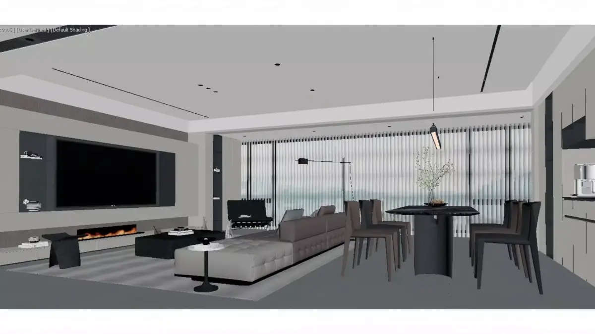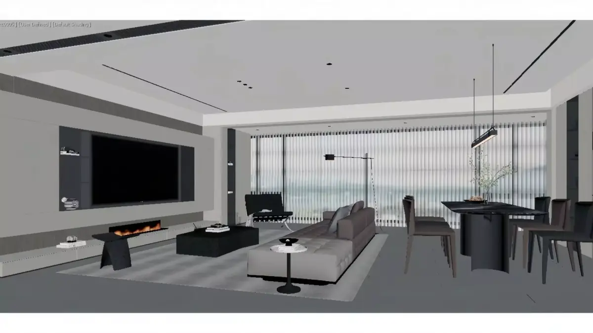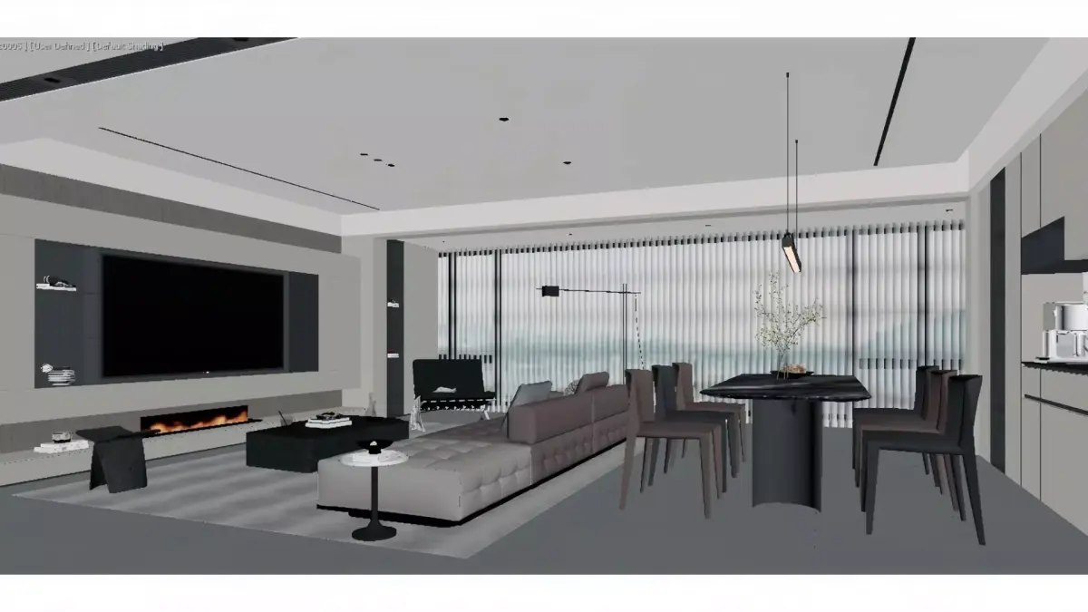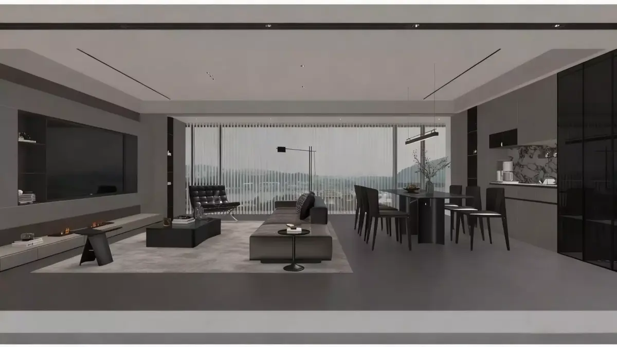 This is a design for a horizontal open-plan living and dining area in the Italian minimalist style. It adopts a main-light-free lighting scheme combined with ambient light strips to create a high-end atmosphere. The primary color palette consists of light brown and off-white, complemented by furniture such as leather sofas and marble sideboards, resulting in an overall space that is bright, spacious and elegant.The TV background wall integrates built-in storage and decorative cabinets, while the dining area is connected to the living room for seamless interaction. Large floor-to-ceiling windows paired with dreamy curtains enhance natural lighting, making this a modern home case that balances aesthetic appeal and practical functionality.