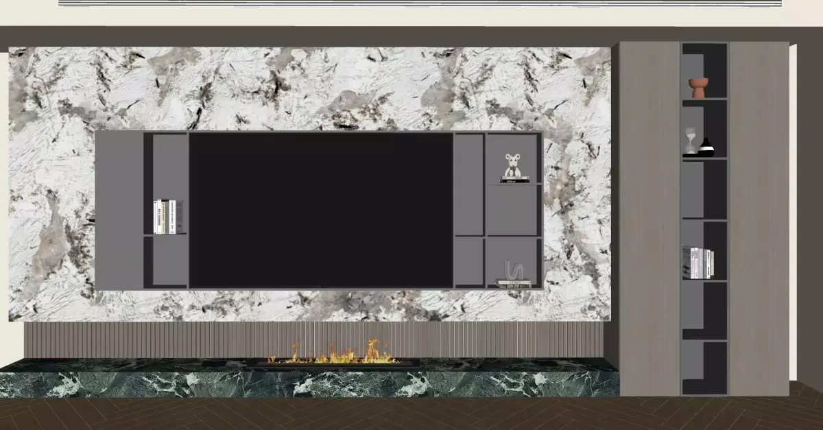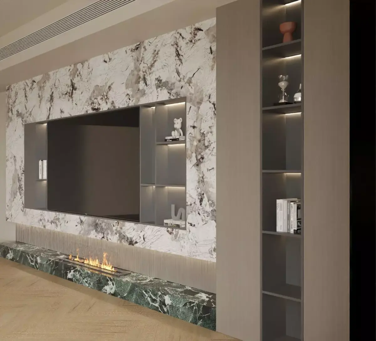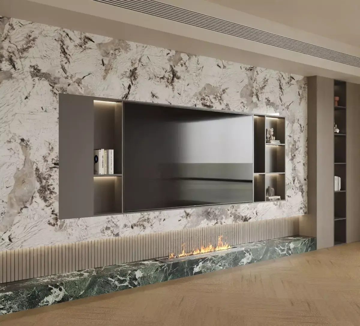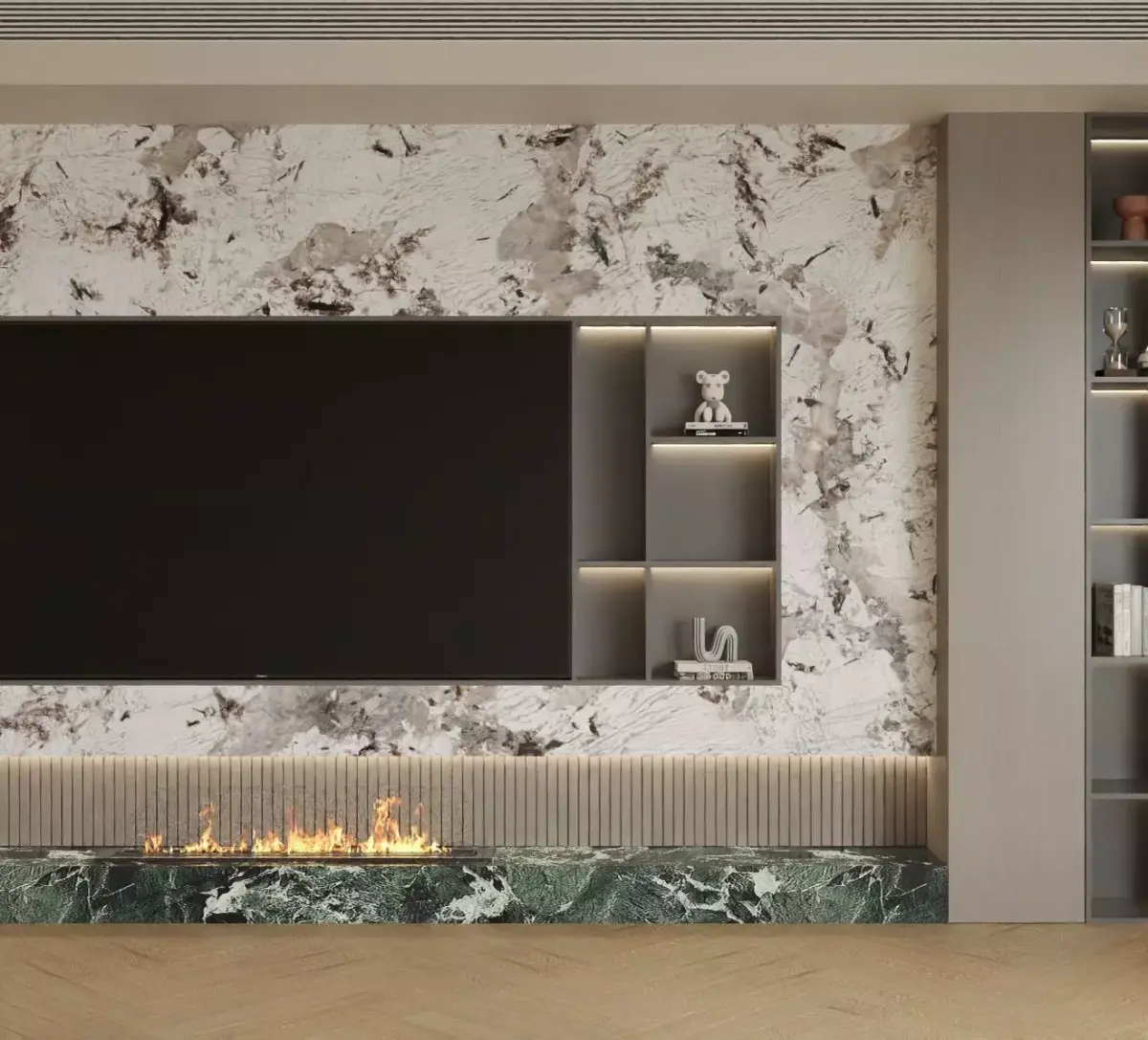 This is a modern light-luxury marble feature wall. The main body is made of off-white marble with unique textures, where the natural gray-black veins interweave like artistic brushstrokes, creating a strong visual impact. A large black TV is embedded in the middle, and the embedded storage compartments on both sides are highlighted with warm lights, displaying books, art ornaments, and trendy toys, adding a touch of life and design sense. The green marble countertop below is paired with a linear fireplace, where the flames dance nimbly, forming a cold-warm contrast with the cool-toned marble above. Combined with the herringbone parquet wooden floor, the overall space creates an exquisite and layered atmosphere. It is an artistic feature wall design that integrates decoration, storage, and atmosphere creation.