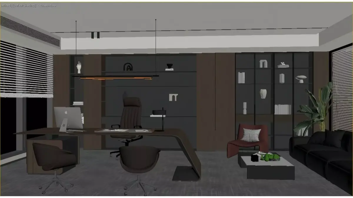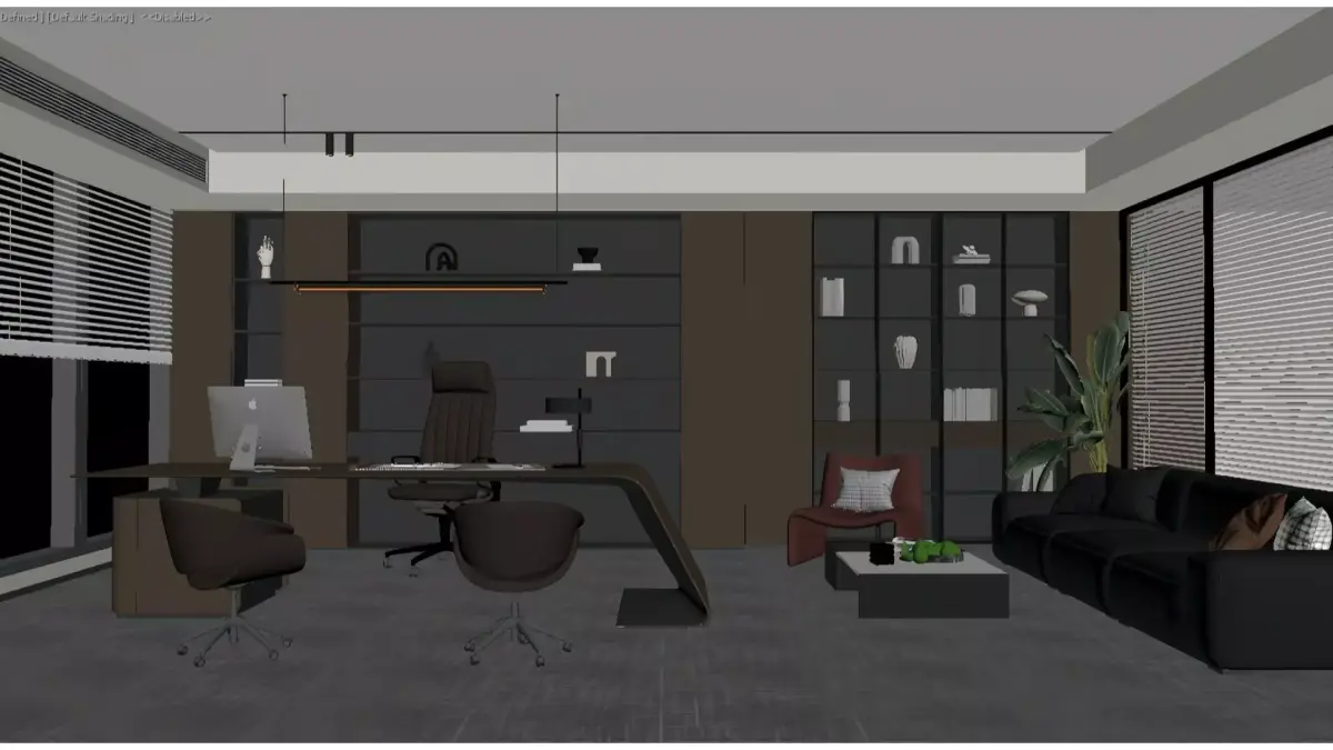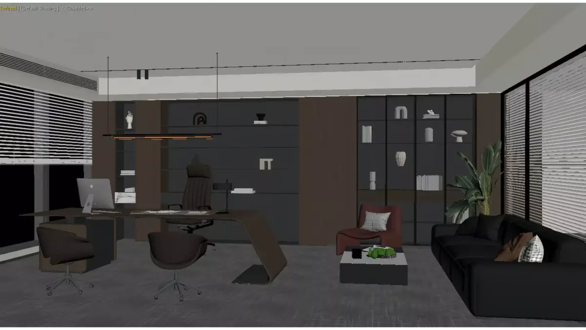 This is a modern light-luxury style CEO office, dominated by high-grade gray and dark brown wood tones, paired with leather furniture and recessed ambient lights to create a composed and sophisticated business atmosphere.The space integrates a working area and a reception area: the working area is equipped with a minimalist large desk and a high-back executive chair, with floor-to-ceiling windows bringing in the urban view; the reception area features a combination of dark leather sofas and bright-colored accent chairs, complemented by green plants for decoration.Open bookshelves and glass display cabinets are embedded with warm lighting, which not only serve a practical purpose but also enhance the spatial texture. Overall, the office perfectly combines business functionality with high-end aesthetics.