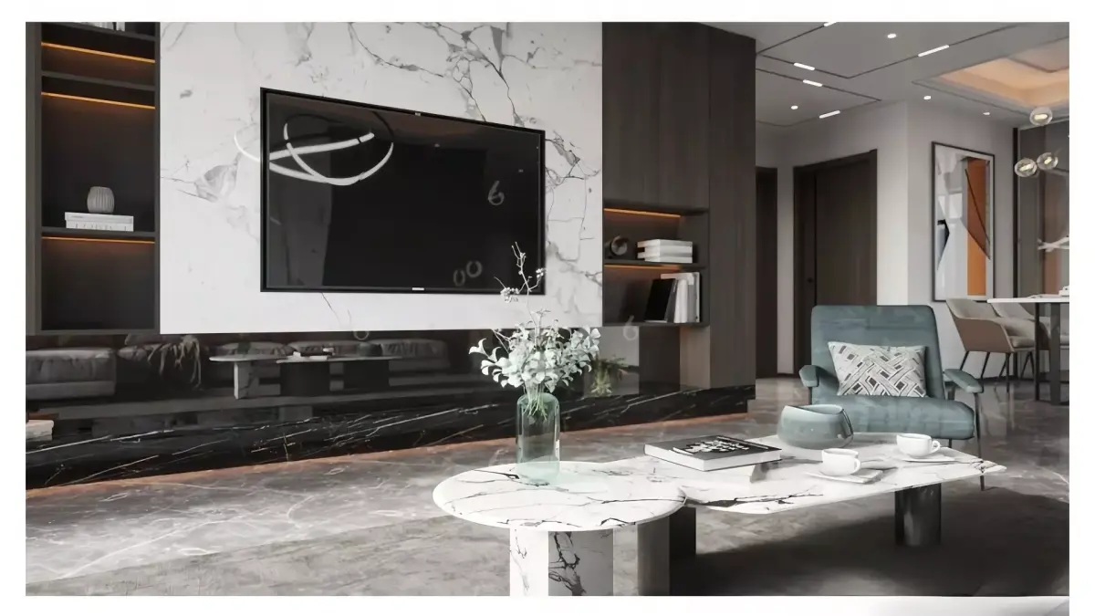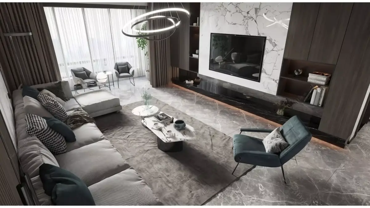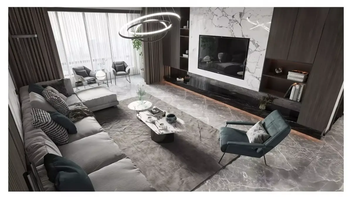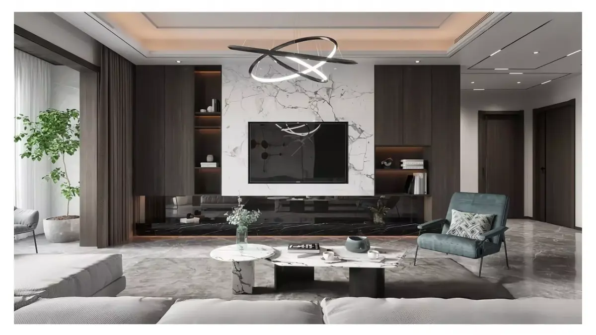 This living room is a typical example of modern light luxury style: it mainly uses low-saturation gray and white as the overall tone, with dark brown wooden grilles and dark green soft furnishings as layered accents, creating a high-end texture without being dull.The details in the space are very memorable: the floating ceiling combined with the no-main-light design makes the ceiling lighter, and the circular layered chandelier serves as the visual focal point; half of the background wall is made of wooden grilles and the other half features marble texture, softening the cold and rigid feeling; the L-shaped upholstered sofa is matched with a combined marble coffee table, and together with soft furnishings with metal lines (such as the frame of the single chair), it perfectly balances the delicacy of light and the texture of luxury, creating an overall atmosphere that is relaxed and transparent.