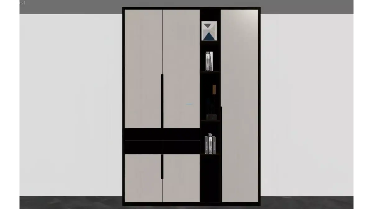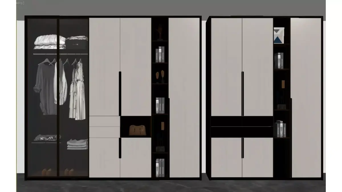 This is a fully customized wardrobe designed in a modern light luxury style. Taking black, white and gray as the main color palette and accented with golden lines, it presents a sleek and high-end visual appeal.The left side features transparent glass doors paired with built-in lighting, which not only facilitates the display of clothes but also enhances the ambiance of the space. The middle and right sections combine closed cabinet doors with open storage compartments, balancing the privacy of storage with the function of display. Meanwhile, details such as vertical grain decorations and metal ornaments are incorporated, making the storage space both practical and decorative. It is suitable for home styles such as modern simplicity and Italian minimalism