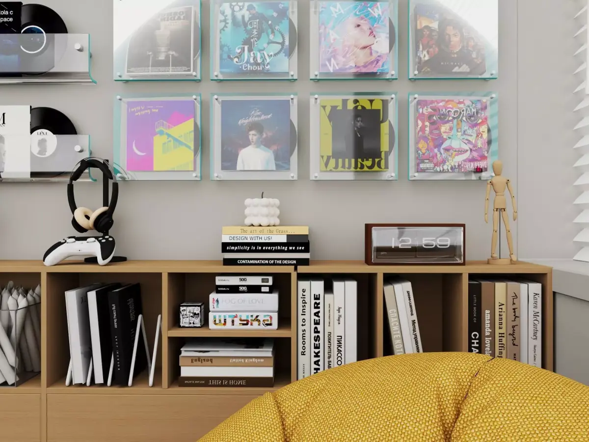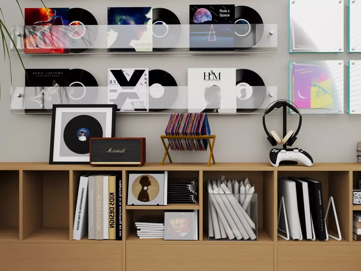 A high-quality, modern 3D interior scene designed by music enthusiasts, featuring a stylish wall displaying vinyl records and carefully selected furniture and props.