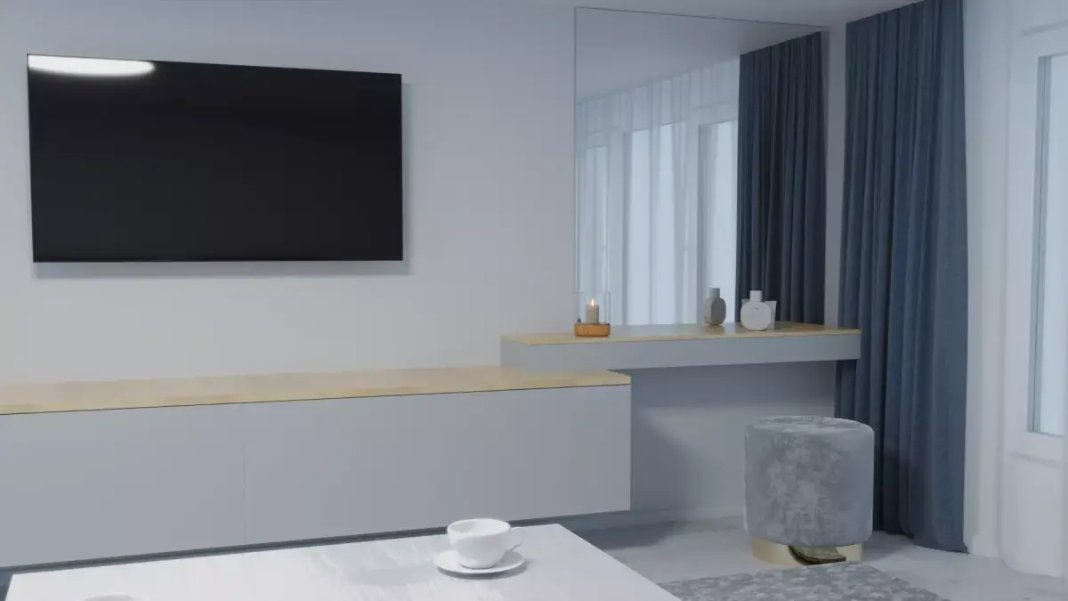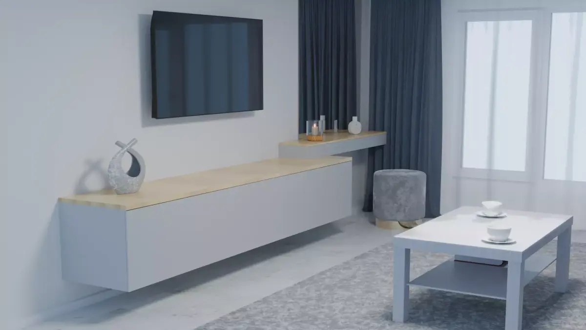 This is a modern minimalist living room interior scene, created with realistic materials and lighting in Blender.The model includes all main furniture elements — sofa, table, TV, wall cabinet, curtains, and decorative items.Perfect for interior visualization, rendering, animation, or architectural projects.