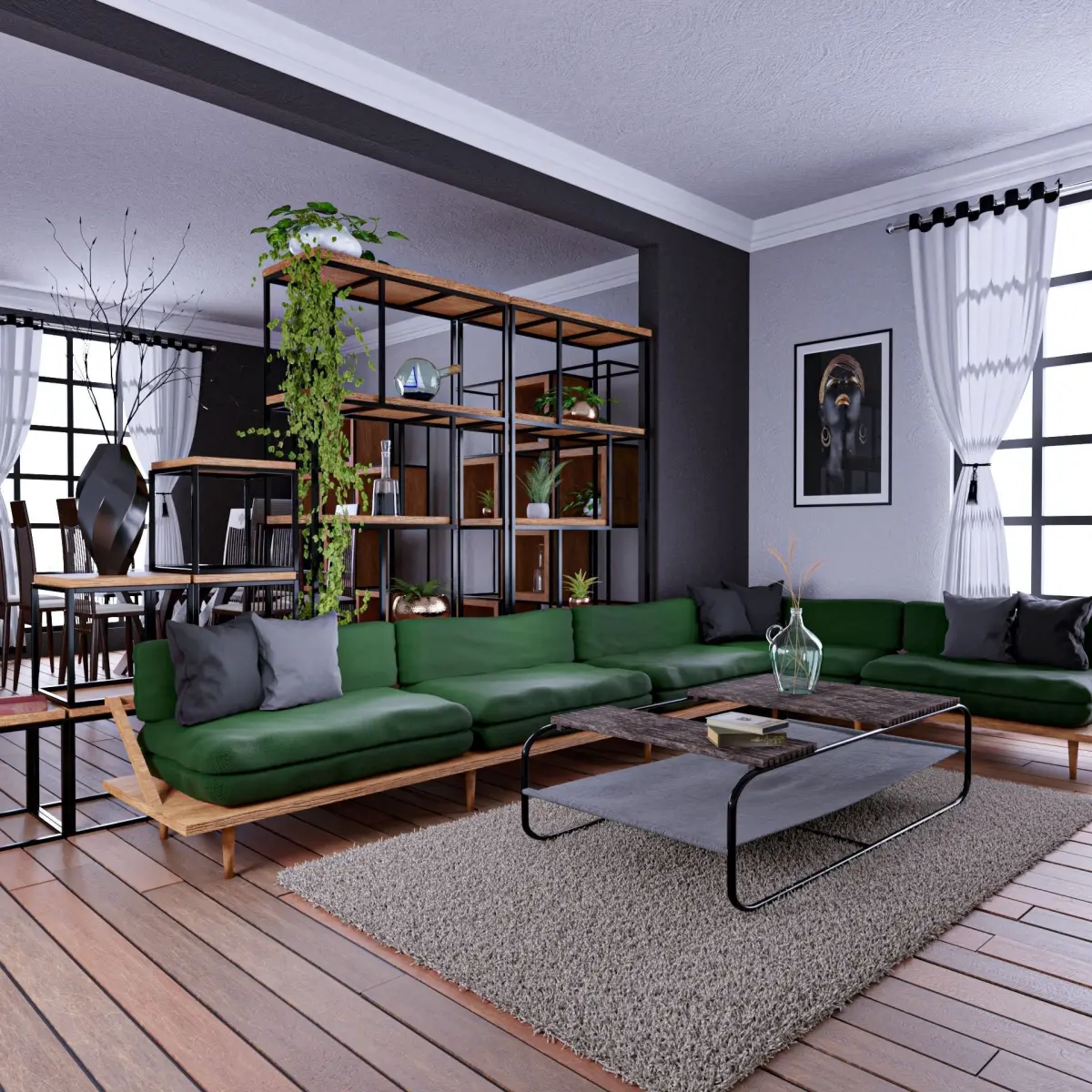 Hello, it's me again, this time bringing a very complete living room, complete with a coffee table, l-shaped sofa, carpet, dining table, industrial shelves used as dividers, decorations, plants, climbing plants, curtains and more (ps all models used in the scene are also available in their independent versions for less on my profile, check it out!!!).Made 100% in BLENDER, but as always imported in all formats, such as collada.dae for sketchup, fbx for most software, apart from these it also has stl and obj. and obviously the .blendwell, that's it, enjoy.