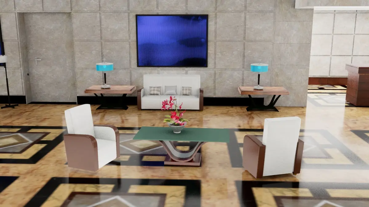 Ceiling: Suspended modern grid ceiling panels with dynamic geometric shapes. Seating Area: Multiple modern chairs and sofas with a clean, contemporary aesthetic. Tables: Stylish wooden side tables with unique angular designs complement the seating areas. Artwork: Wall mounted abstract art pieces to add character and sophistication to the room. Lighting: Modern table lamps with blue tinted glass bases that give the space a unique touch. Wall Panels: Textured wall coverings in neutral tones with black trim, creating a sleek and professional atmosphere. Flooring: Polished wooden floors with intricate inlaid patterns that draw attention to the room’s elegant geometry. TV Screen: A large flatscreen display, ideal for virtual conferencing or multimedia displays in the scene.