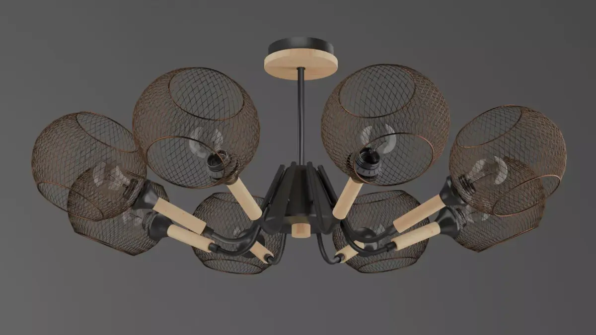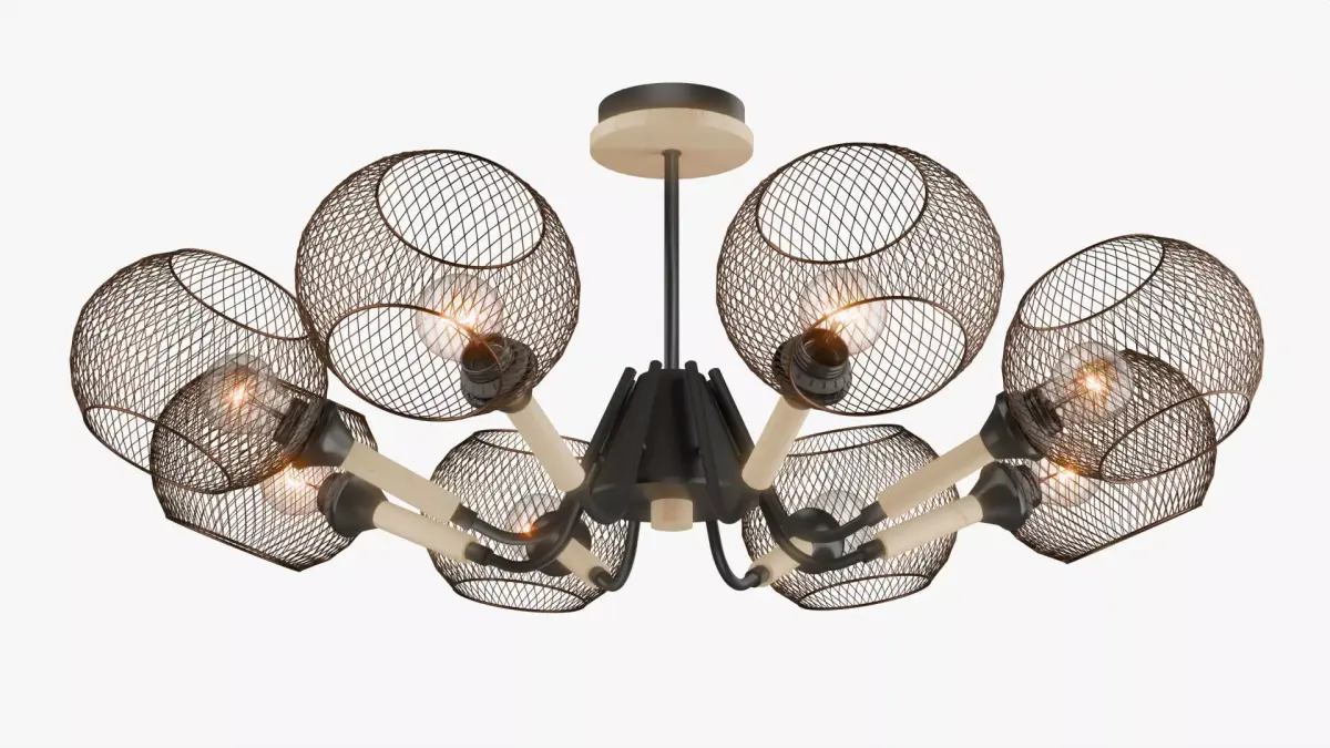 Modern industrial-style ceiling chandelier featuring 8 radial arms with distinctive wire mesh cage shades, black metal framework, and natural wood accents. Perfect for contemporary loft interiors, restaurants, cafes, and residential spaces.