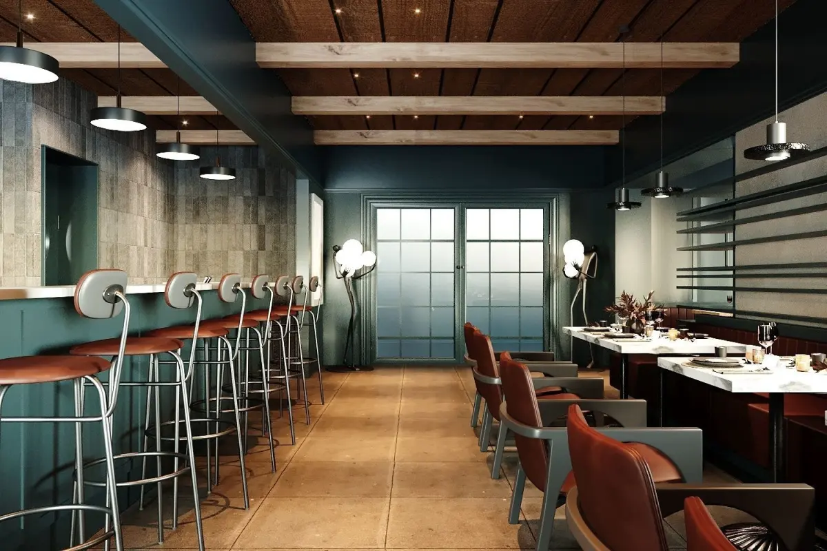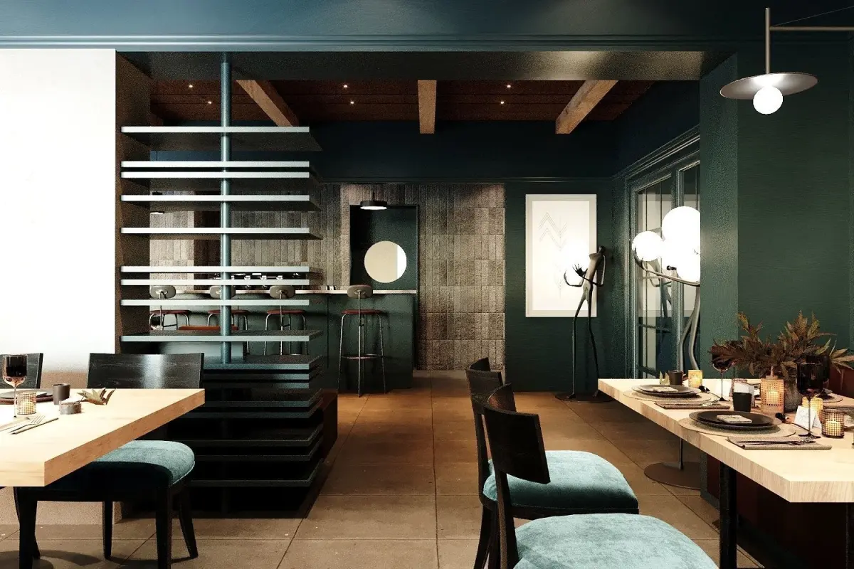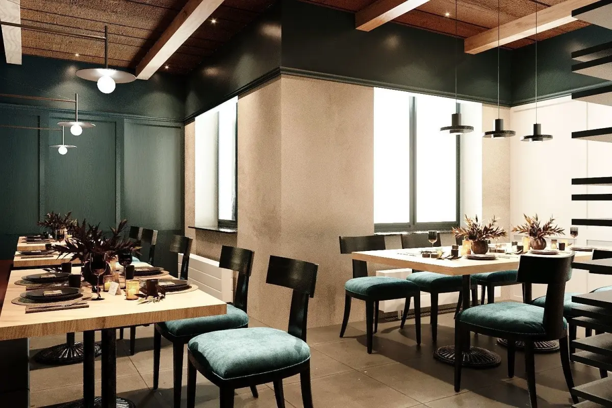 Sleek Interior Design: Immerse yourself in the allure of modern elegance with our impeccably designed restaurant interior. Clean lines, minimalist furnishings, and sophisticated decor elements combine to create a space that exudes refinement and sophistication.
