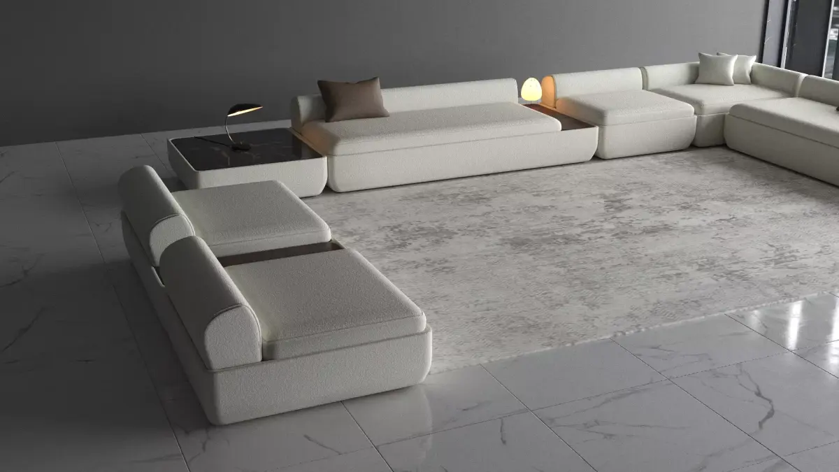 This contemporary modular sofa features a low-profile silhouette with clean geometric lines, designed for modern luxury interiors. Upholstered in a soft bouclé-style fabric, it combines texture with elegance, creating a sophisticated yet inviting seating solution.