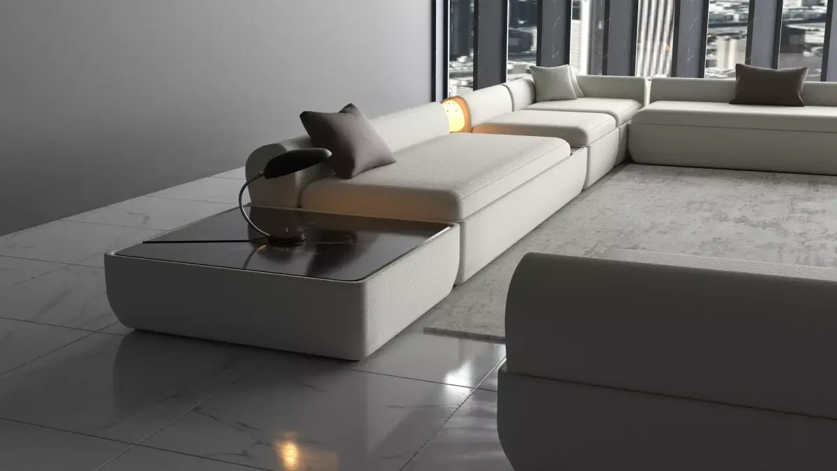 Styled with integrated wooden side tables and warm accent pillows, the sofa enhances both functionality and aesthetics, making it ideal for 3D visualizations, architectural renderings, VR/AR projects, and interior design presentations.