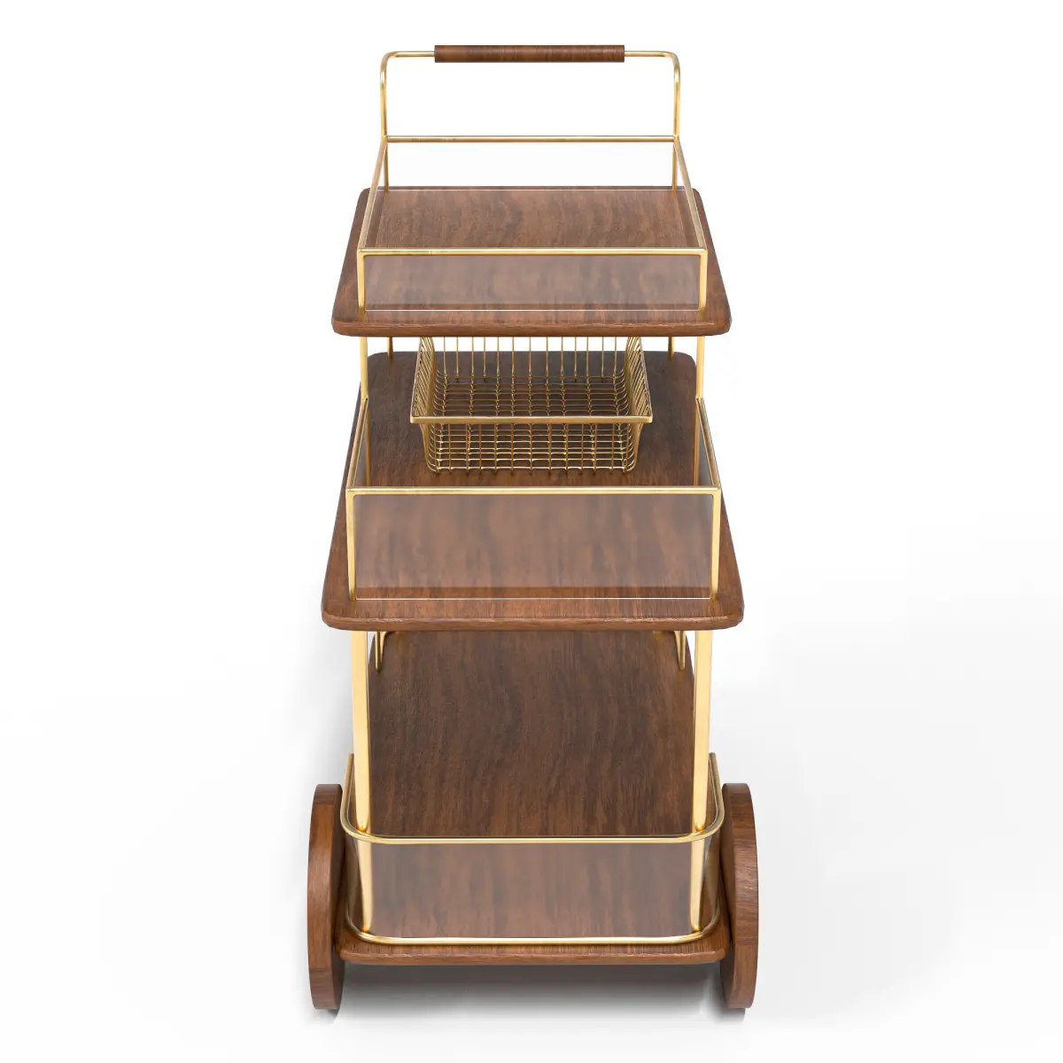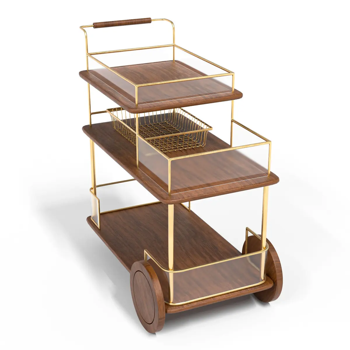 Modern luxe bar cart with gold frame and wooden shelves 3D model