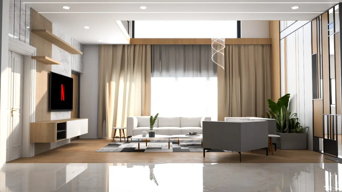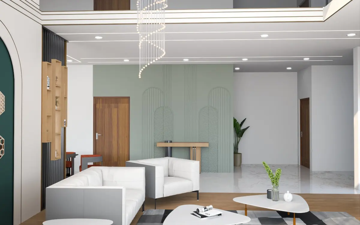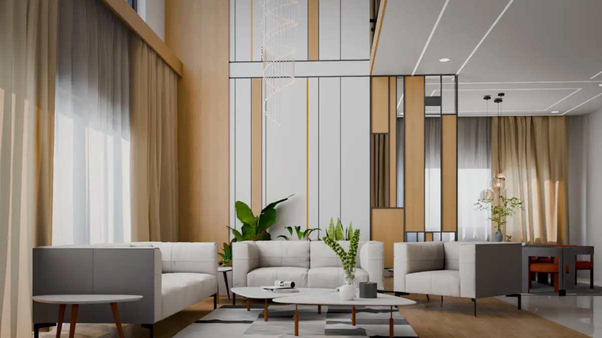 .Fully furnished luxury living room design with intricate detailing.