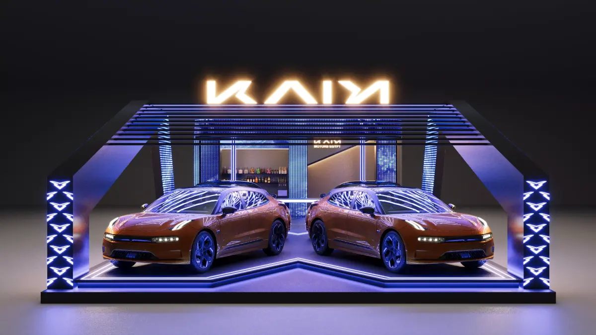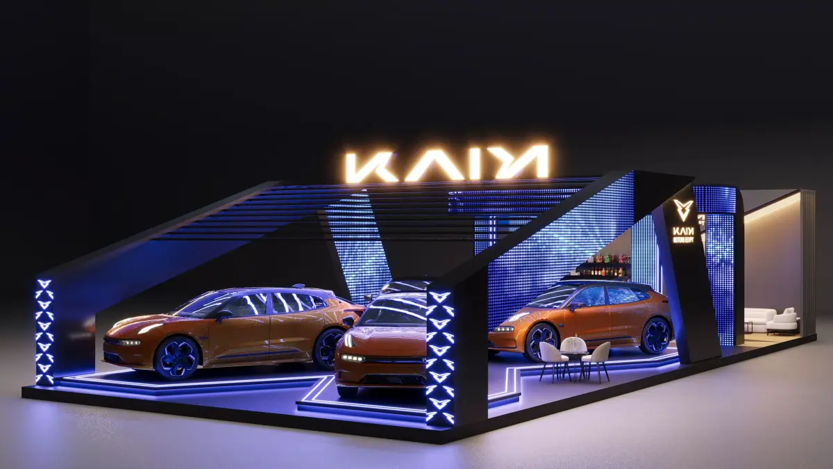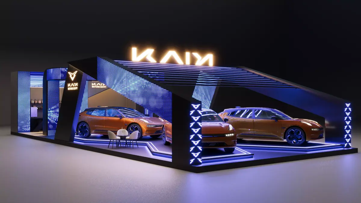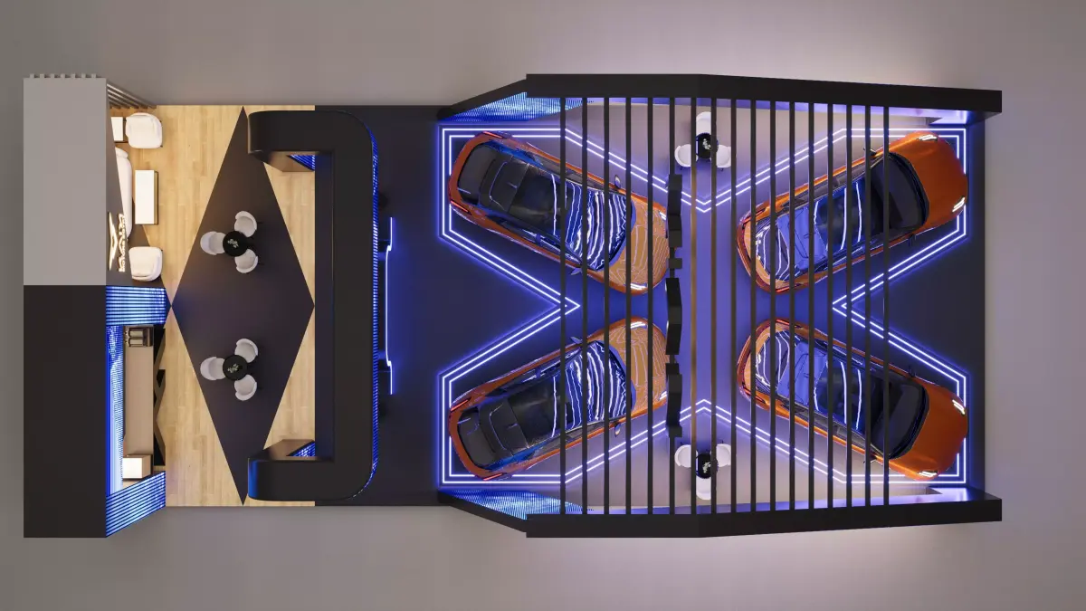 Luxury Car Exhibition Stand - Modern Trade Show Booth.This modern and sleek exhibition booth is designed specifically for car launches, motor shows, and high-end corporate events. It features a futuristic aesthetic with integrated LED screens, premium lighting, and a dedicated VIP lounge area.