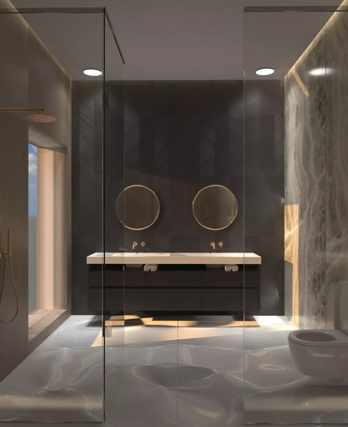 High-quality modern luxury bathroom 3D scene featuring a double sink vanity with wall-mounted faucets, elegant round mirrors with metallic frames, and dramatic wall textures. The design combines dark herringbone tiles with backlit onyx stone, creating a sophisticated and warm atmosphere.Perfect for architectural visualization, interior design projects, or rendering practice.