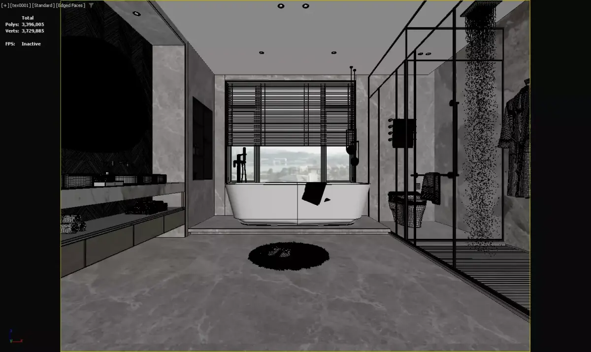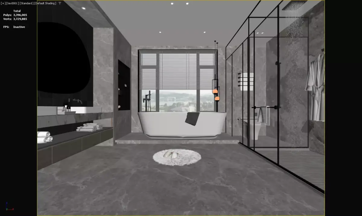3D model of a modern luxury bathroom with marble decor, freestanding tub, and glass shower. Ideal for high - end home interior design, creating a sophisticated and relaxing space.
