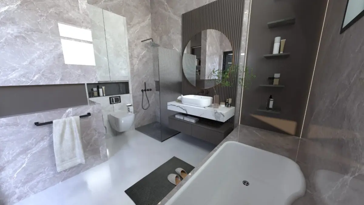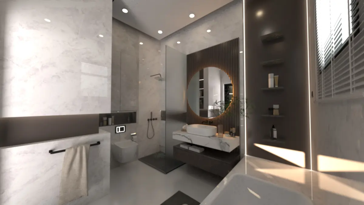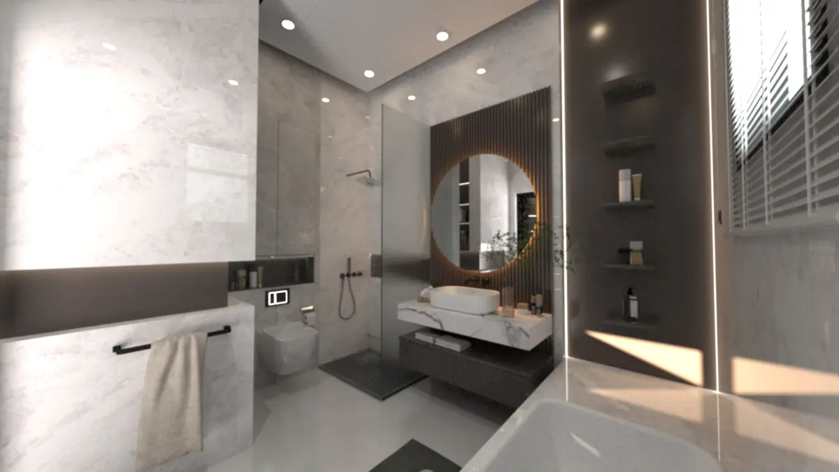 This is a conceptual 3D bathroom scene featuring a luxurious and modern design with premium materials and lighting. The layout includes a walk-in shower, a floating vanity with a marble countertop, decorative wall shelving, and a circular LED mirror.