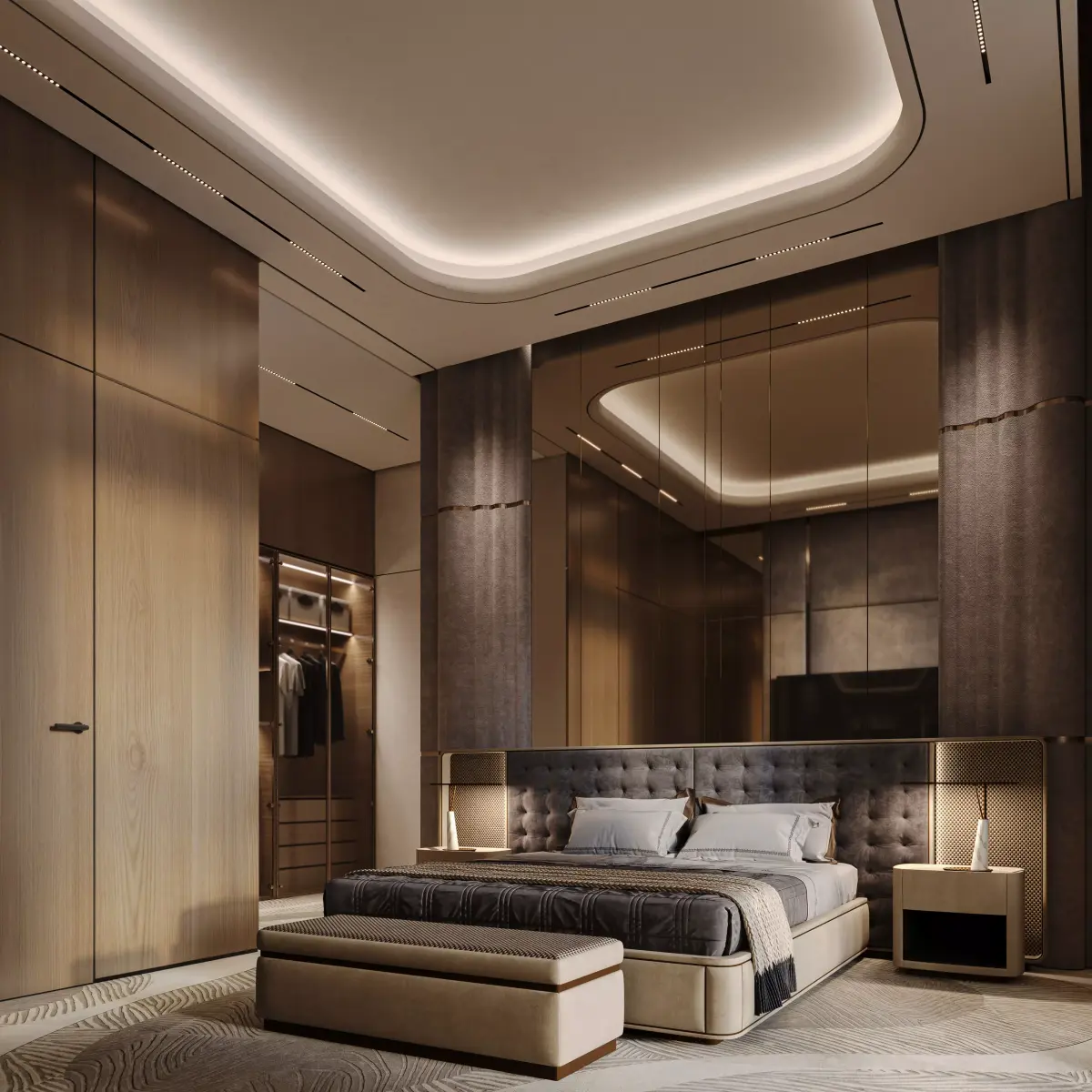 A high-end guest bedroom interior designed with a luxurious and inviting atmosphere. Features a comfortable queen bed, custom lighting, modern decor, and neutral elegant finishes. Perfect for realistic visualizations and interior design presentations.