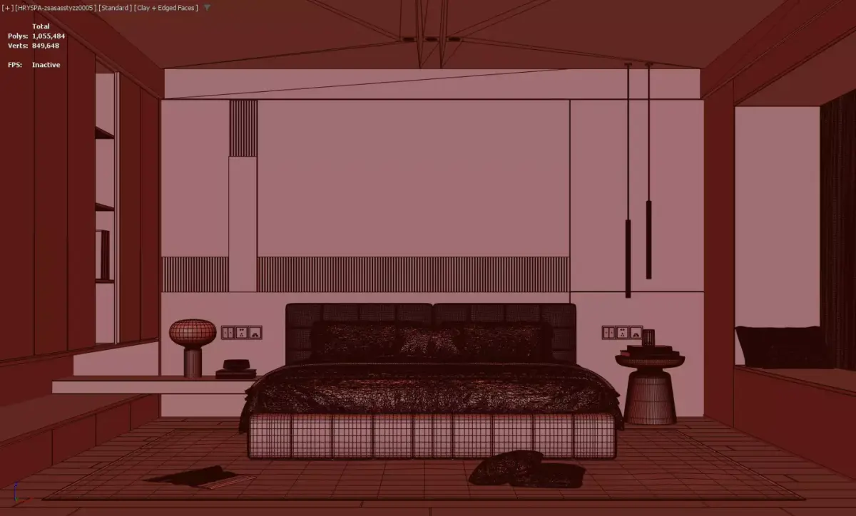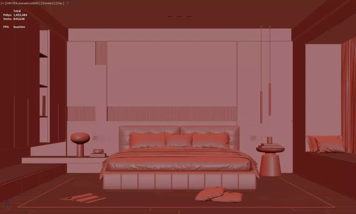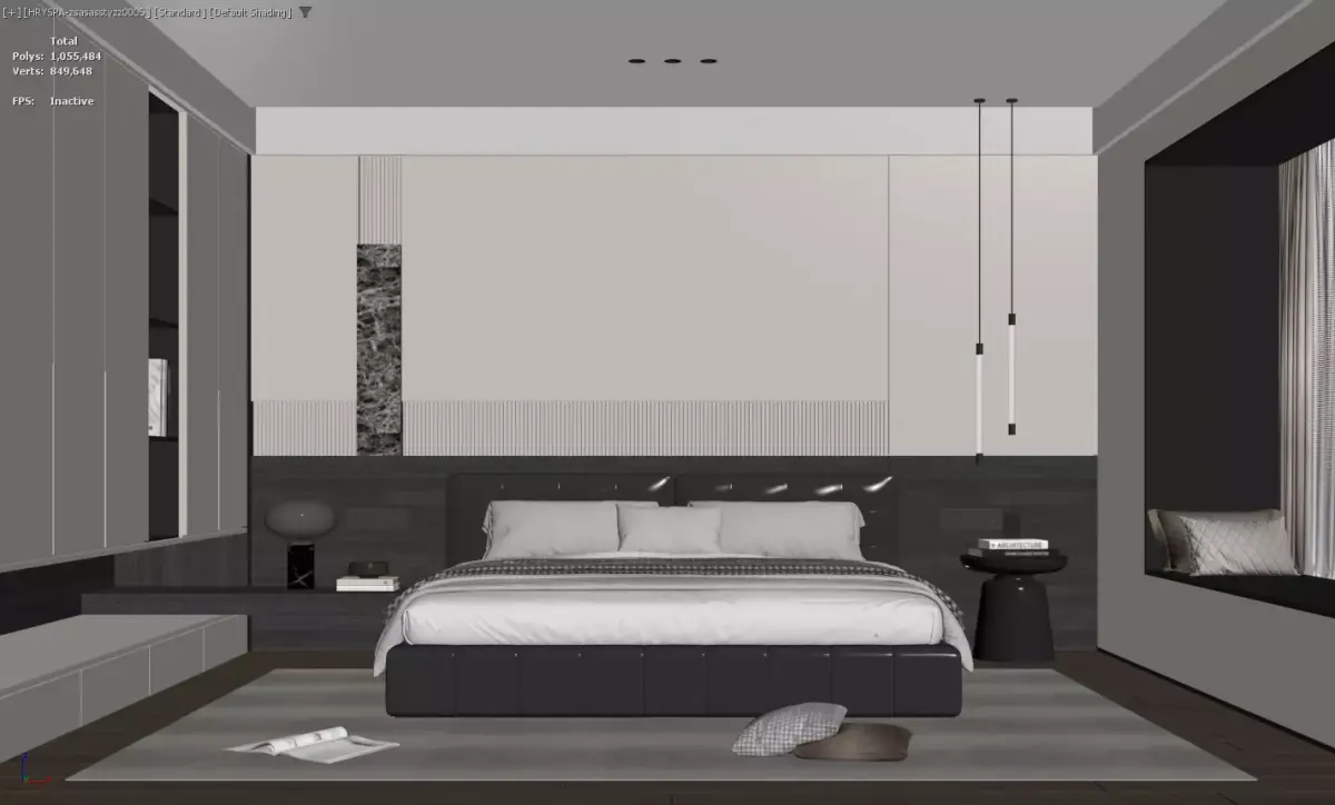 This 3D model showcases a modern luxury bedroom, featuring:Layout & furniture: Leather-upholstered bed with color-blocked bedding, integrated built-in storage cabinets and a window-side leisure bench;Details: Textured accent wall (with marble decor), ambient strip lights and linear chandeliers enhance minimalist high-end texture;Functionality: Balancing sleep and light leisure, it suits modern high-end home scenes for interior design renderings.