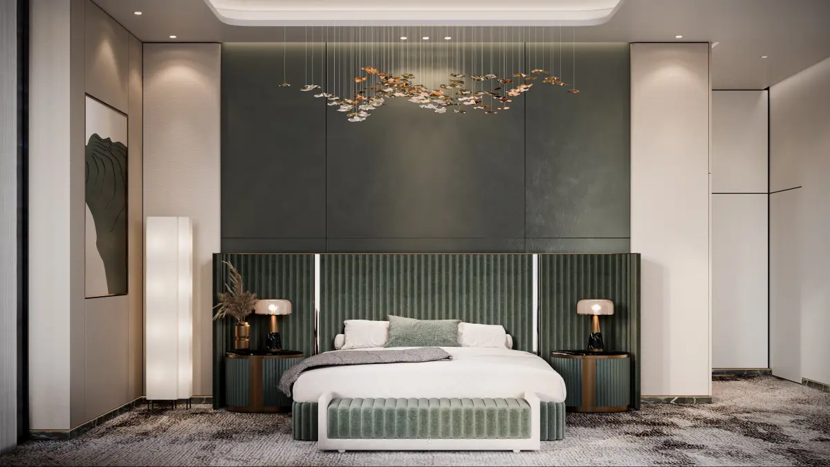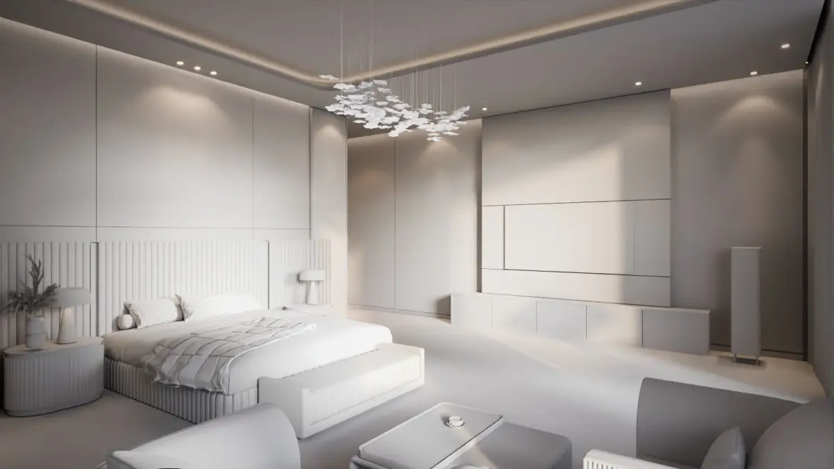 High-end 3D master bedroom with Visionnaire Italian furniture. Features include elegant bed design, modern seating, luxury finishes, ambient lighting, and decorative wall panels—perfect for interior visualization, rendering, and architectural projects.