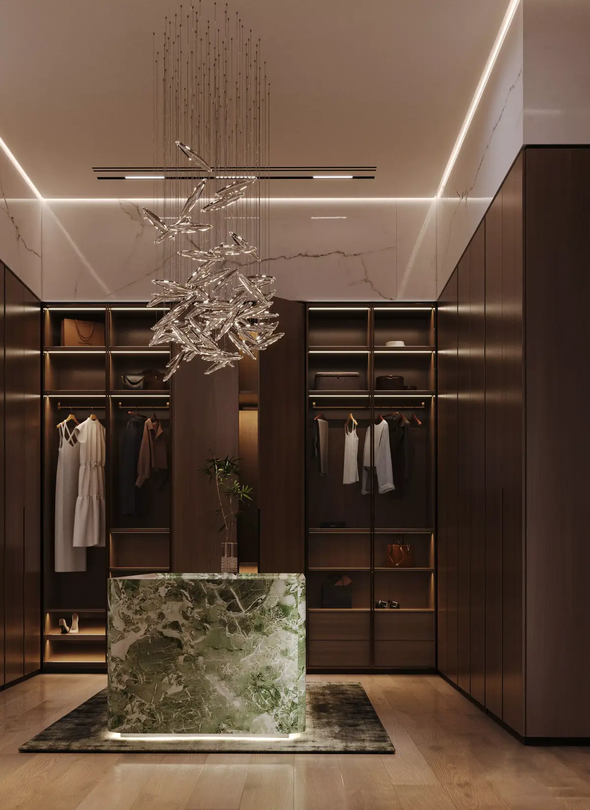 Scene Contains:Bed, nightstands, custom wall panelsCeiling design with cove lightingCurtains, windows, flooringArtwork frames, carpet, decorWalk-in wardrobe area or seating corner (optional)