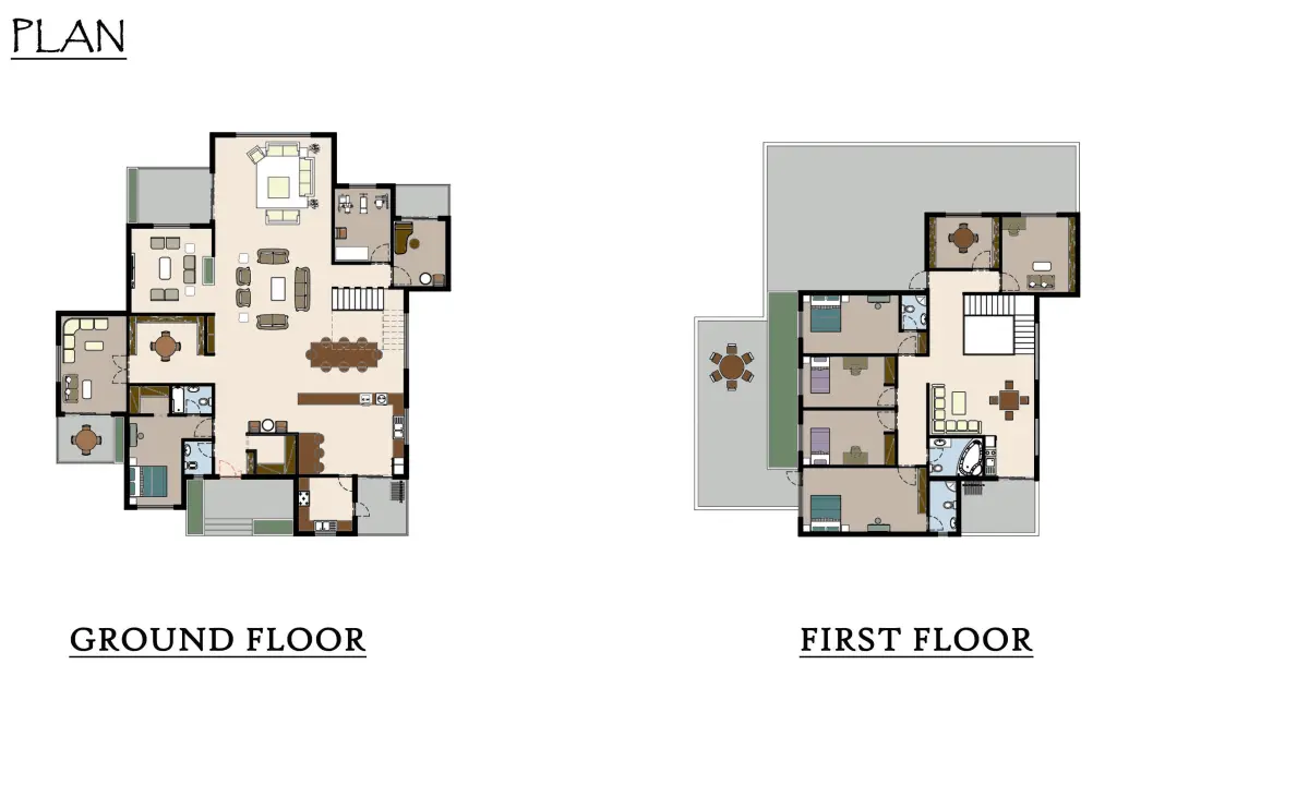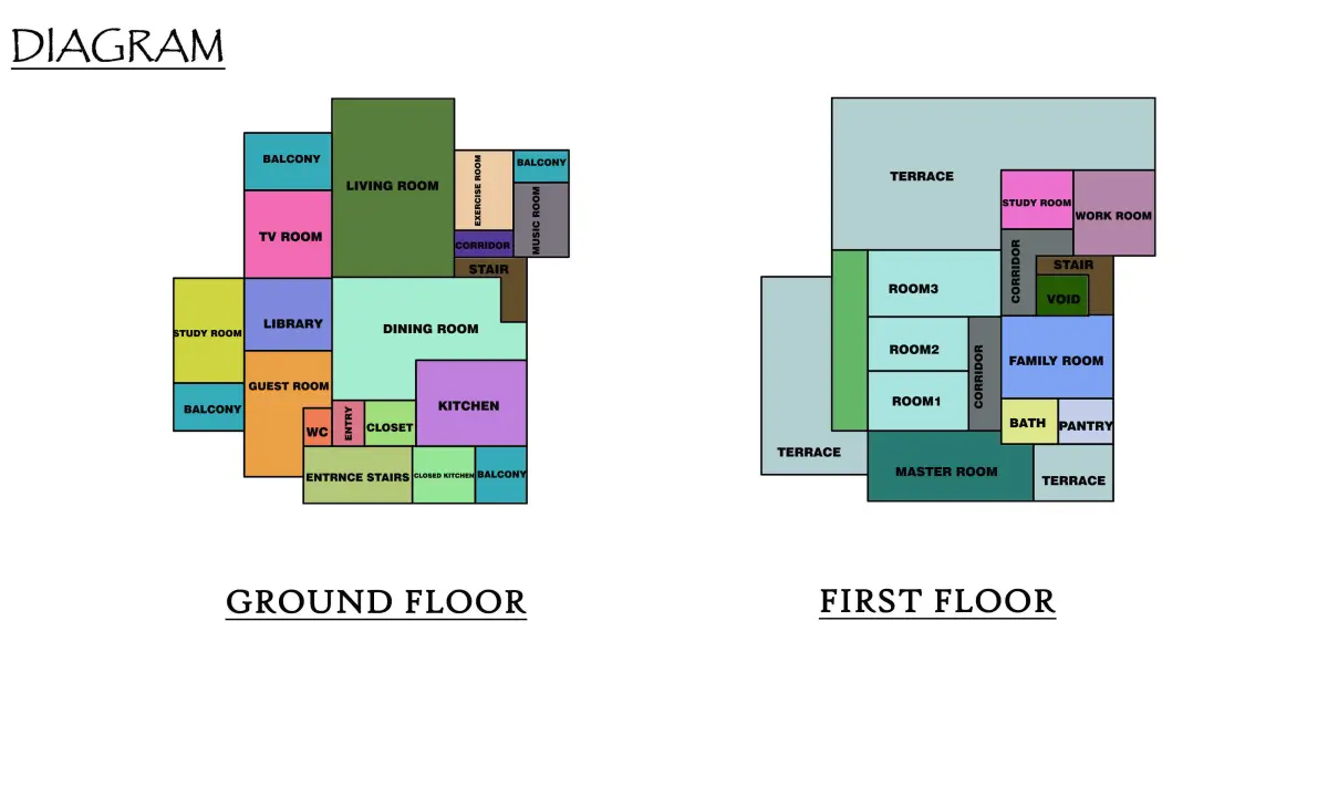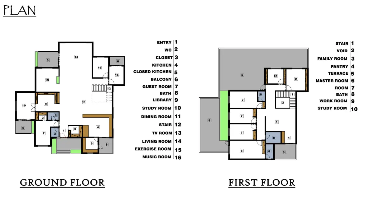 Ground Floor Features: • Entrance lobby with shoe cabinet space • Guest bedroom with attached bathroom • Common guest toilet (Powder room) • Private living room • Formal public living room (Reception) • TV room • Dining area • Main kitchen and service kitchen • Office / Study room • Gym / Fitness room