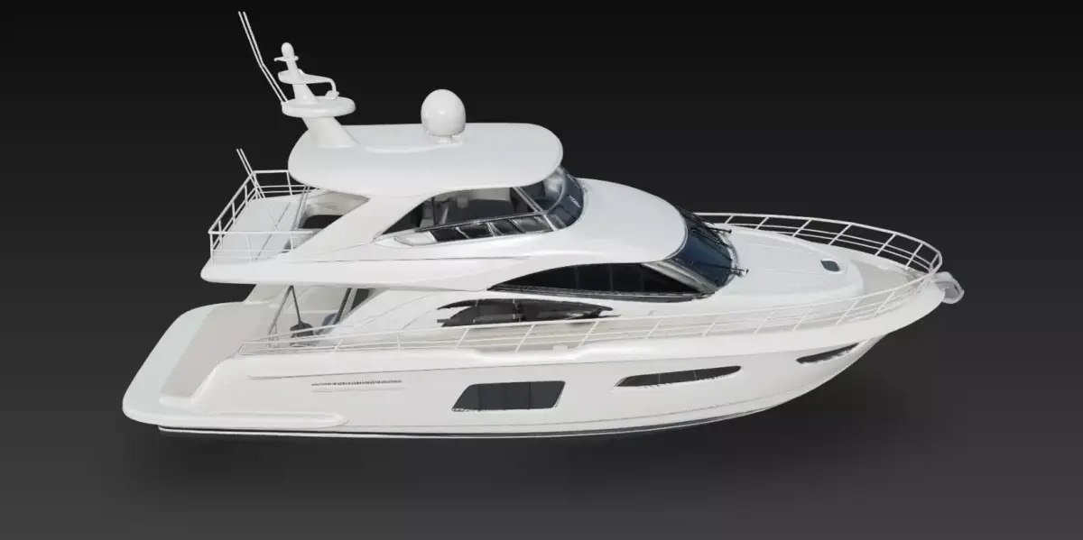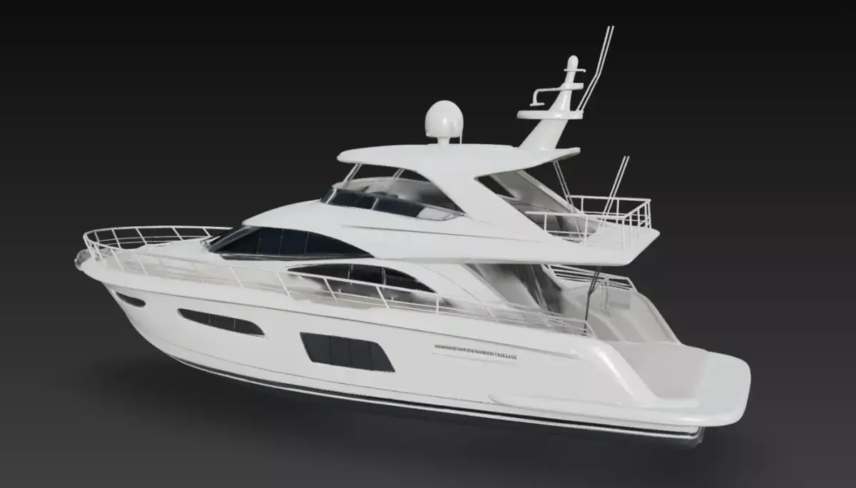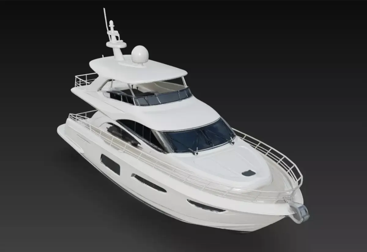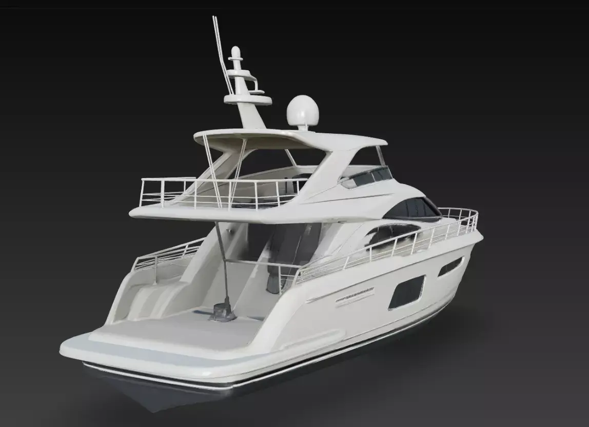 The model includes detailed exterior elements such as the flybridge control area, radar and antenna systems, stainless safety railings, rear deck platform, tinted cabin glazing, and carefully sculpted hull curvature. These details provide strong visual realism while maintaining a clean and organized structure for professional production use.