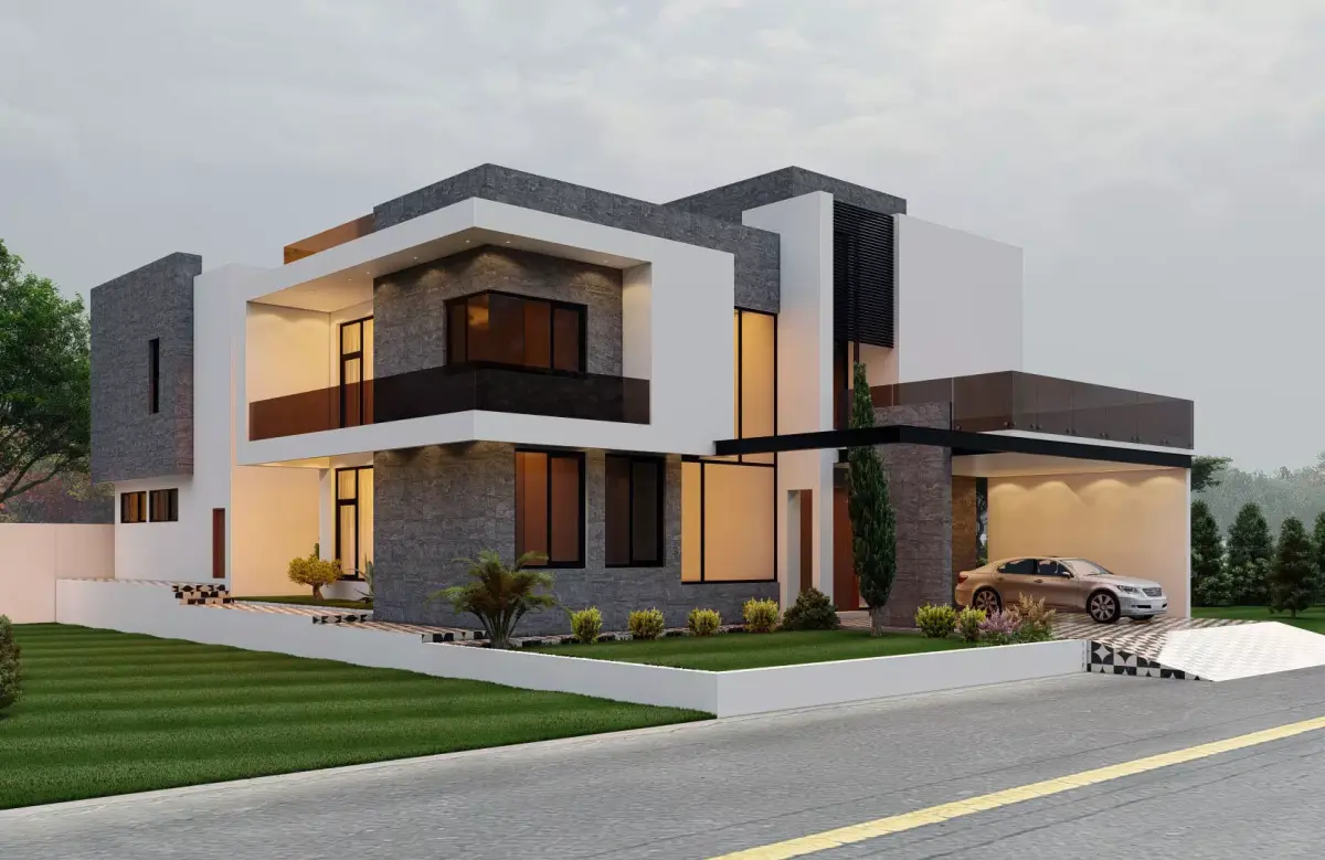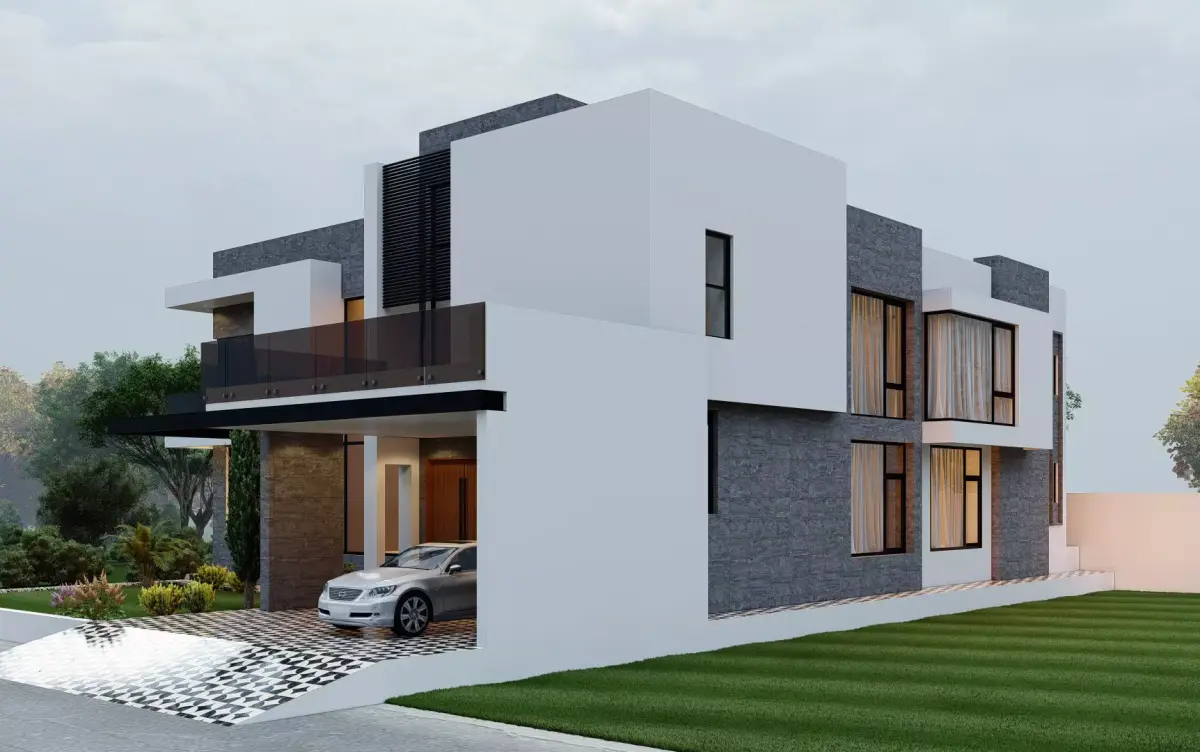 A photorealistic modern house design featuring a detailed façade, car porch, and landscaping. Fully textured and render-ready.