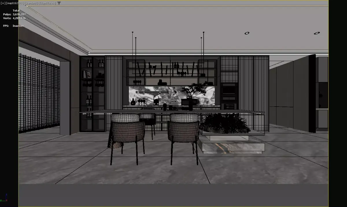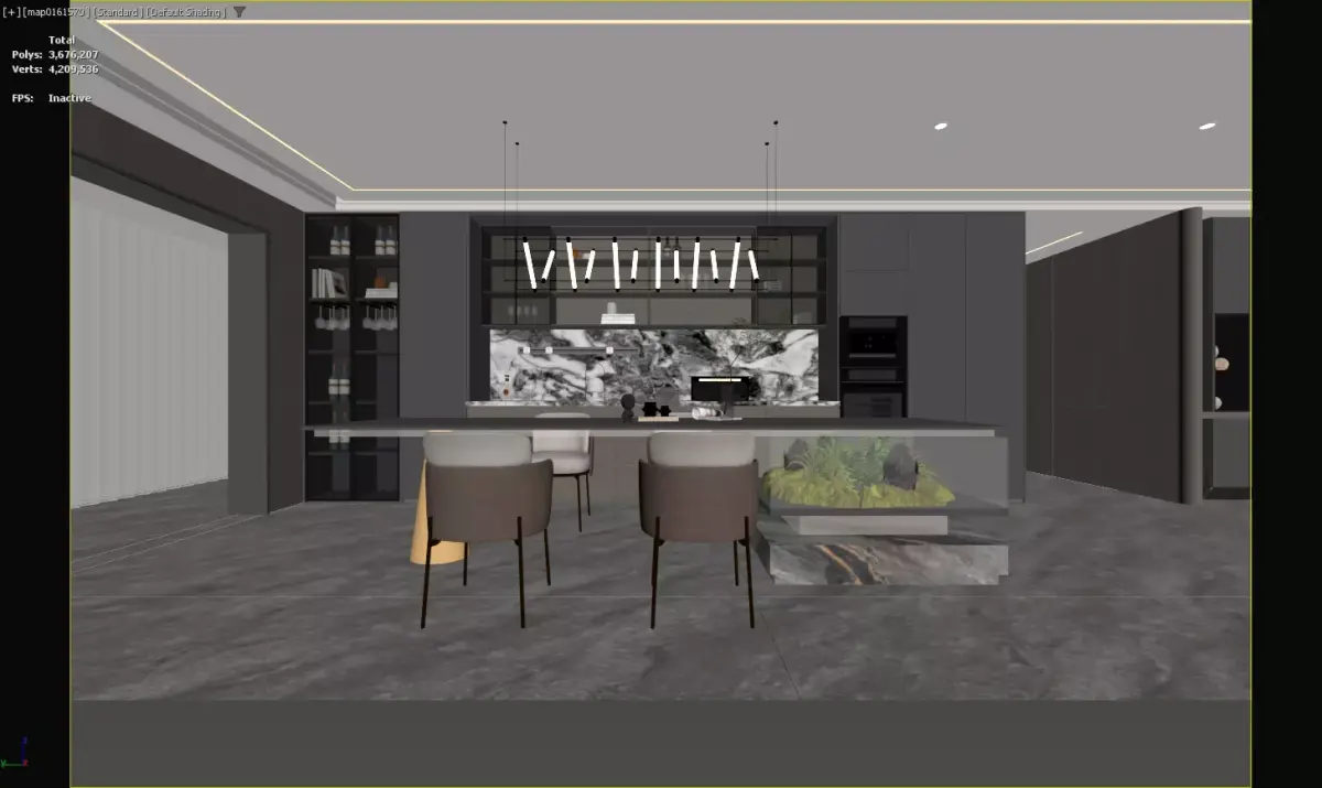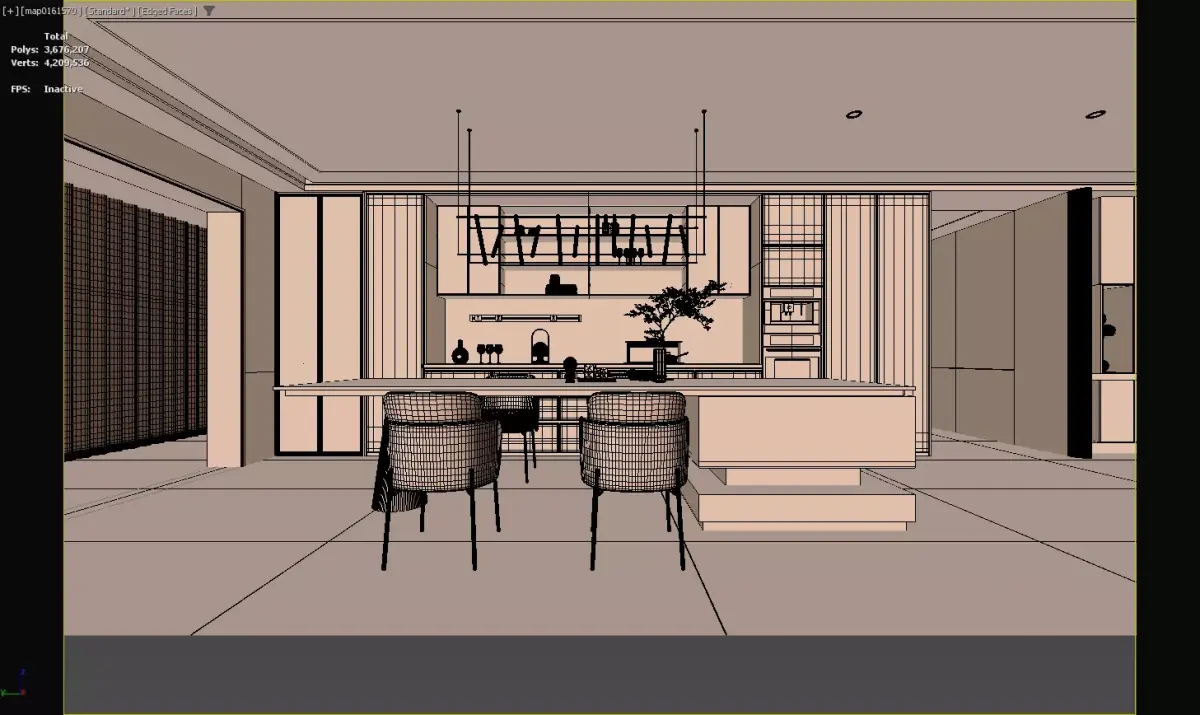 Modern luxury kitchen and dining space featuring a sleek dining table, stylish chairs, built-in cabinetry with integrated lighting, a wine display area, and a marble backsplash. Ideal for high-end home interior design, creating an elegant and functional culinary and dining environment.