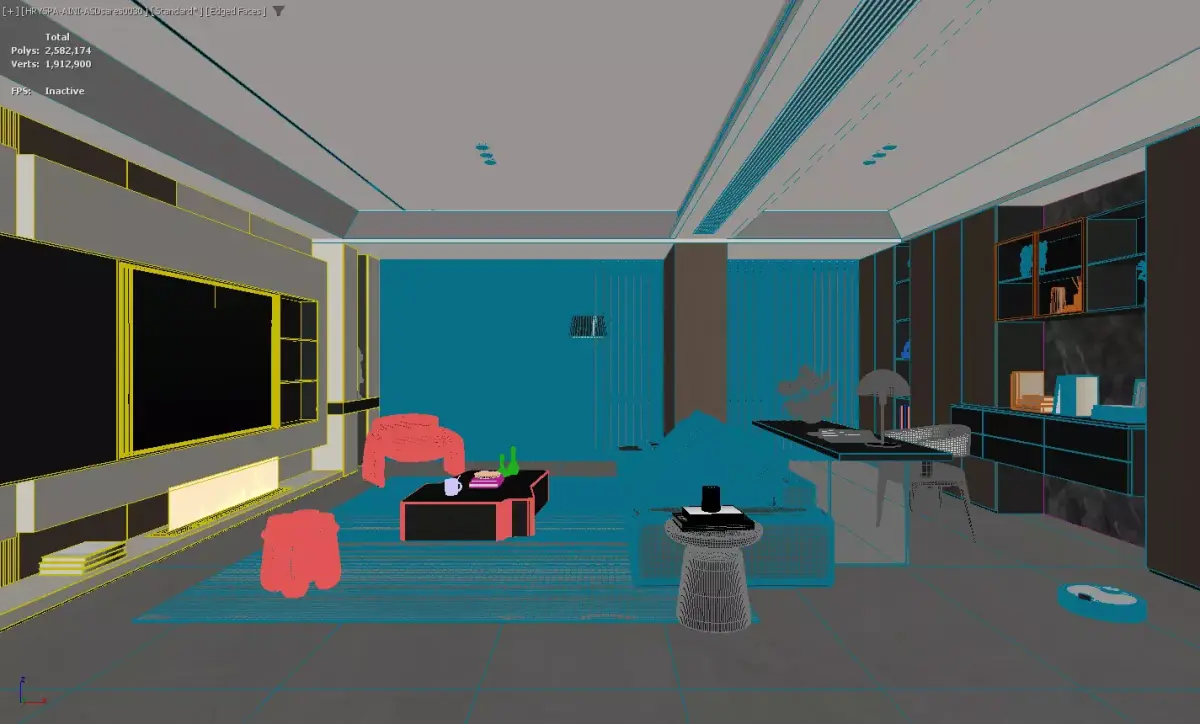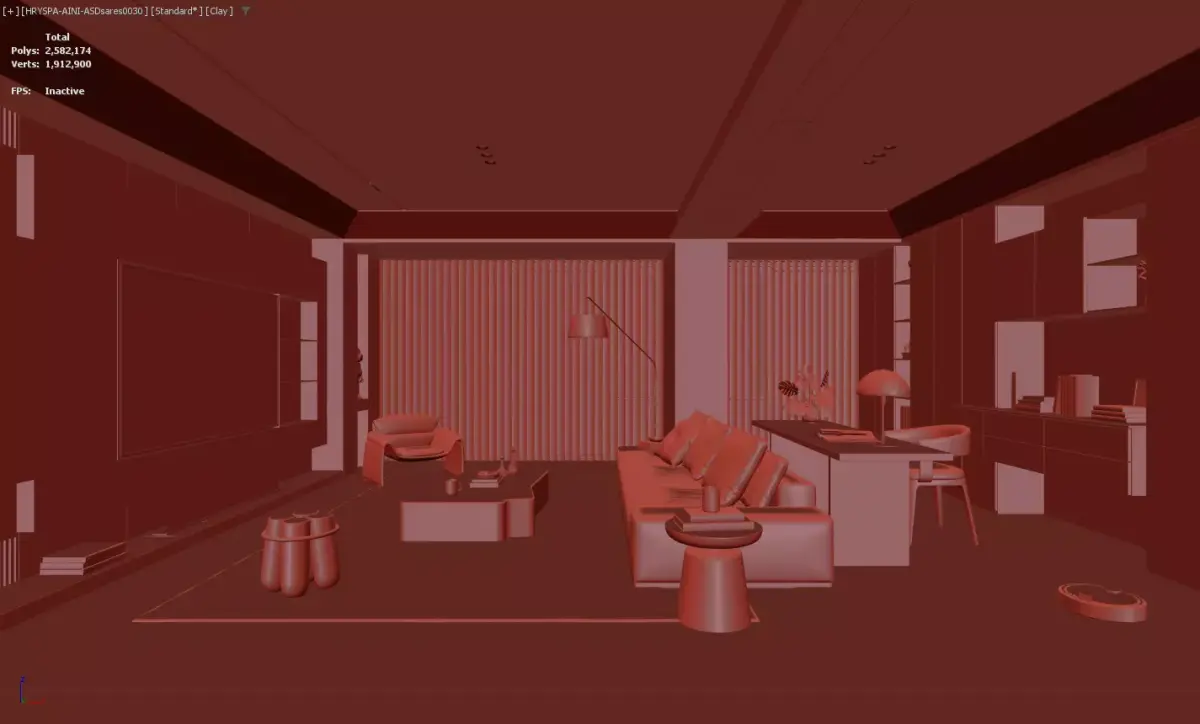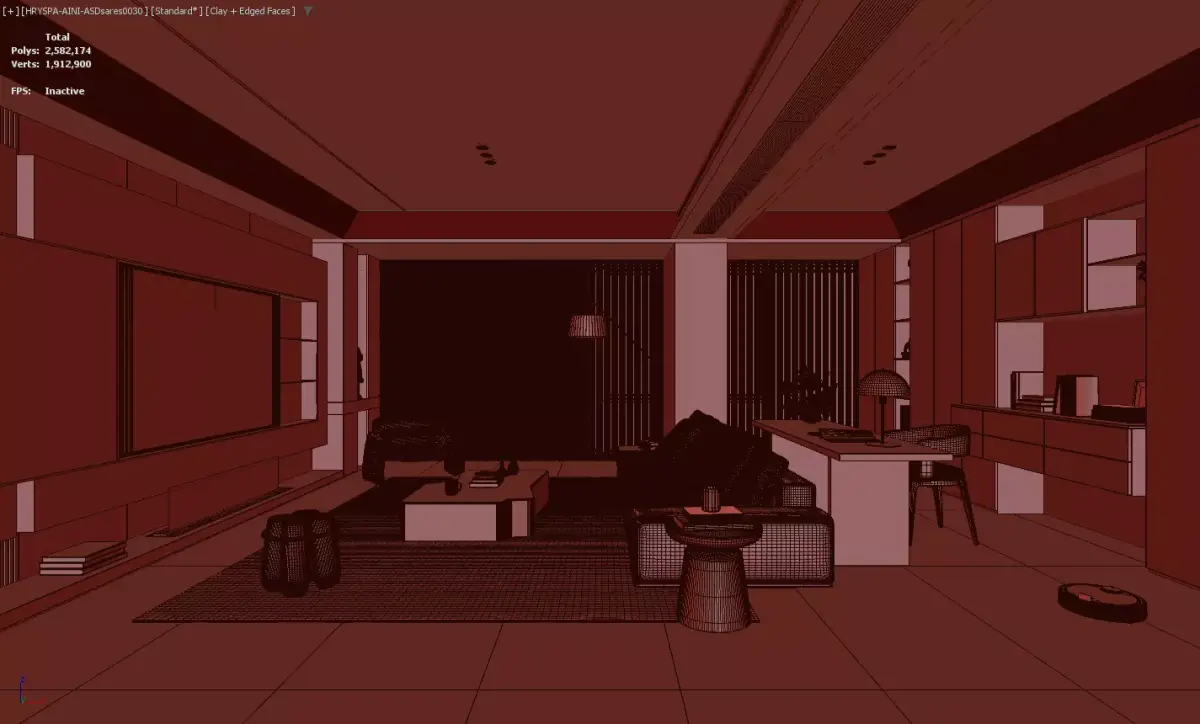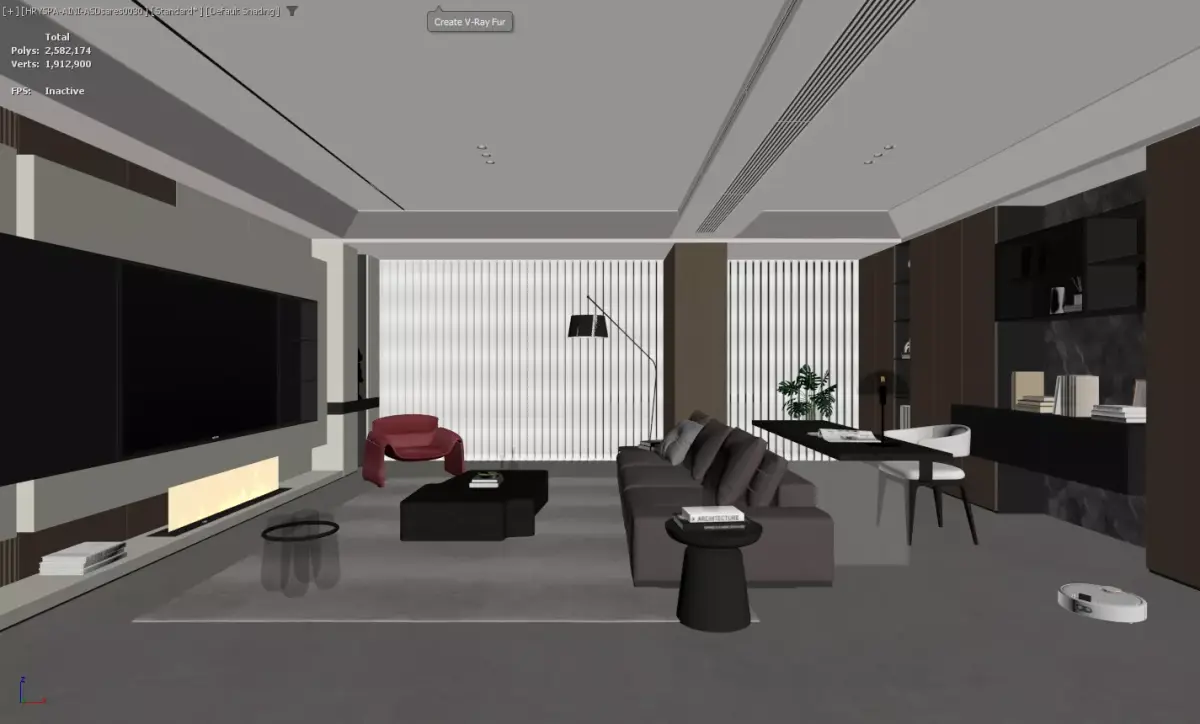 This 3D model showcases a modern luxury living room, featuring:Furniture: Leather sofa, color-blocked coffee table, red accent chair, paired with built-in fireplace and TV wall;Details: Ambient strip lights, floor lamp, and glass-door storage cabinets enhance minimalist high-end texture;Functionality: Balancing leisure viewing and light office (side table), it suits modern high-end homes for design renderings.