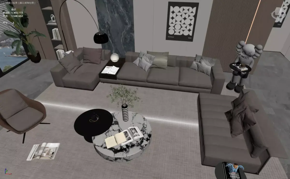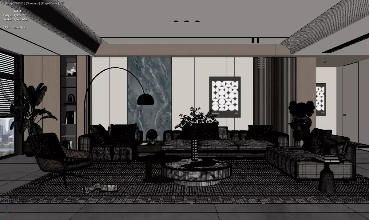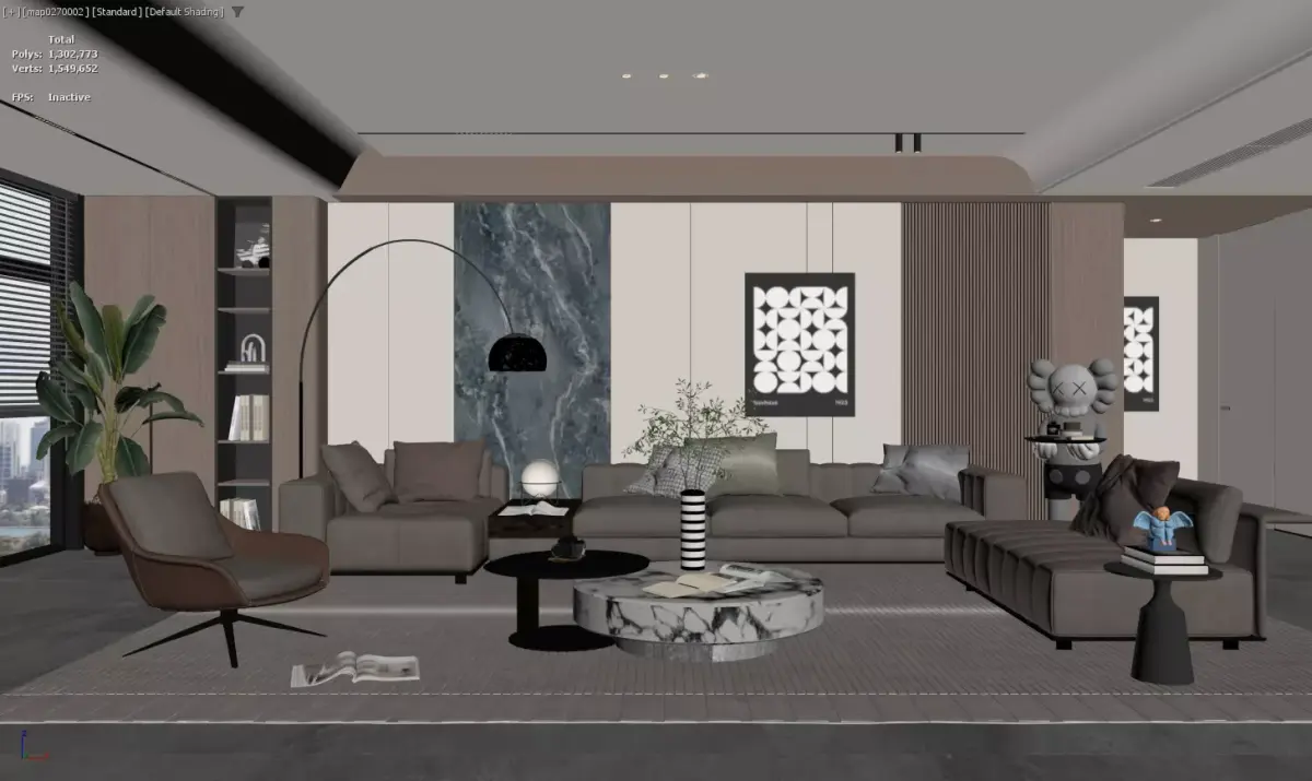 Modern luxury living room featuring a modular beige sofa set, a marble coffee table, a tan leather armchair, layered ambient lighting, and curated decor (sculptural figure, abstract art, potted plant). The space also includes a textured rug, a floor-to-ceiling window with city views, and built-in shelving with decorative items. Ideal for upscale homes, it blends contemporary design with comfort and artistic flair for both relaxation and entertainment.