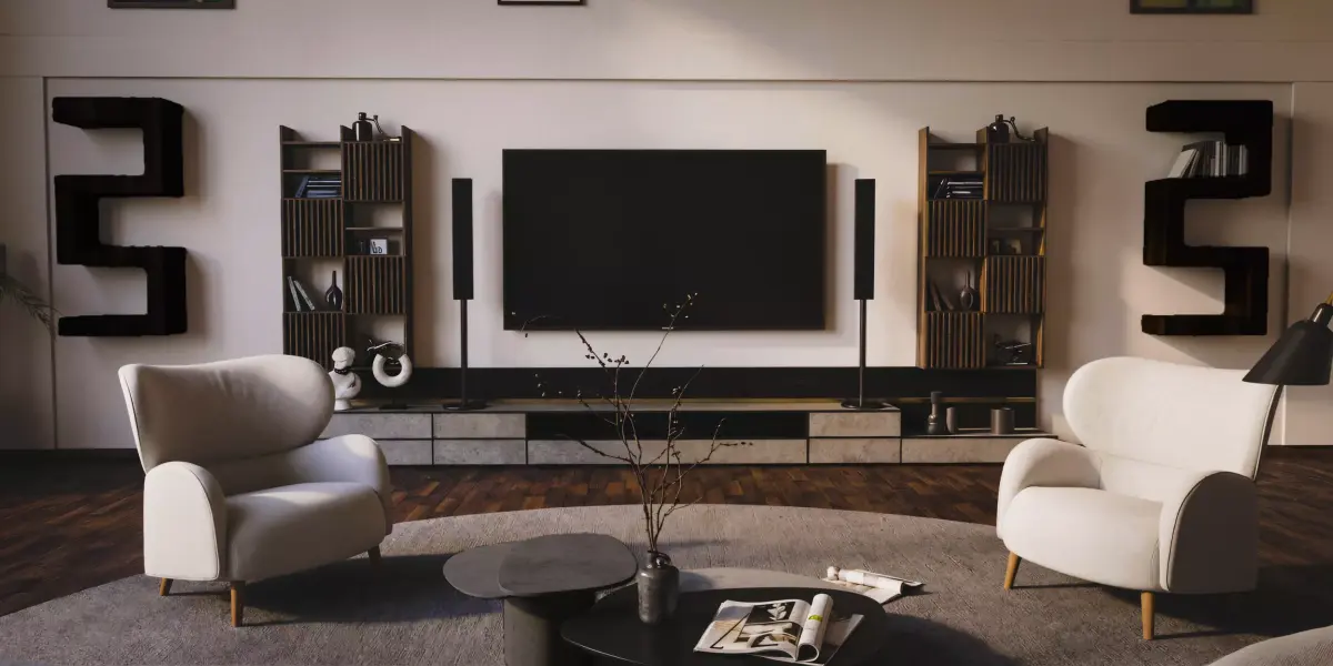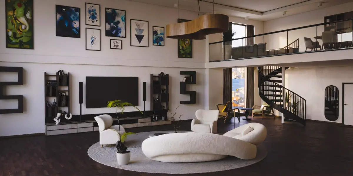 -Detailed Decor: Includes a gallery wall with abstract art, realistic indoor plants, and premium lighting fixtures.