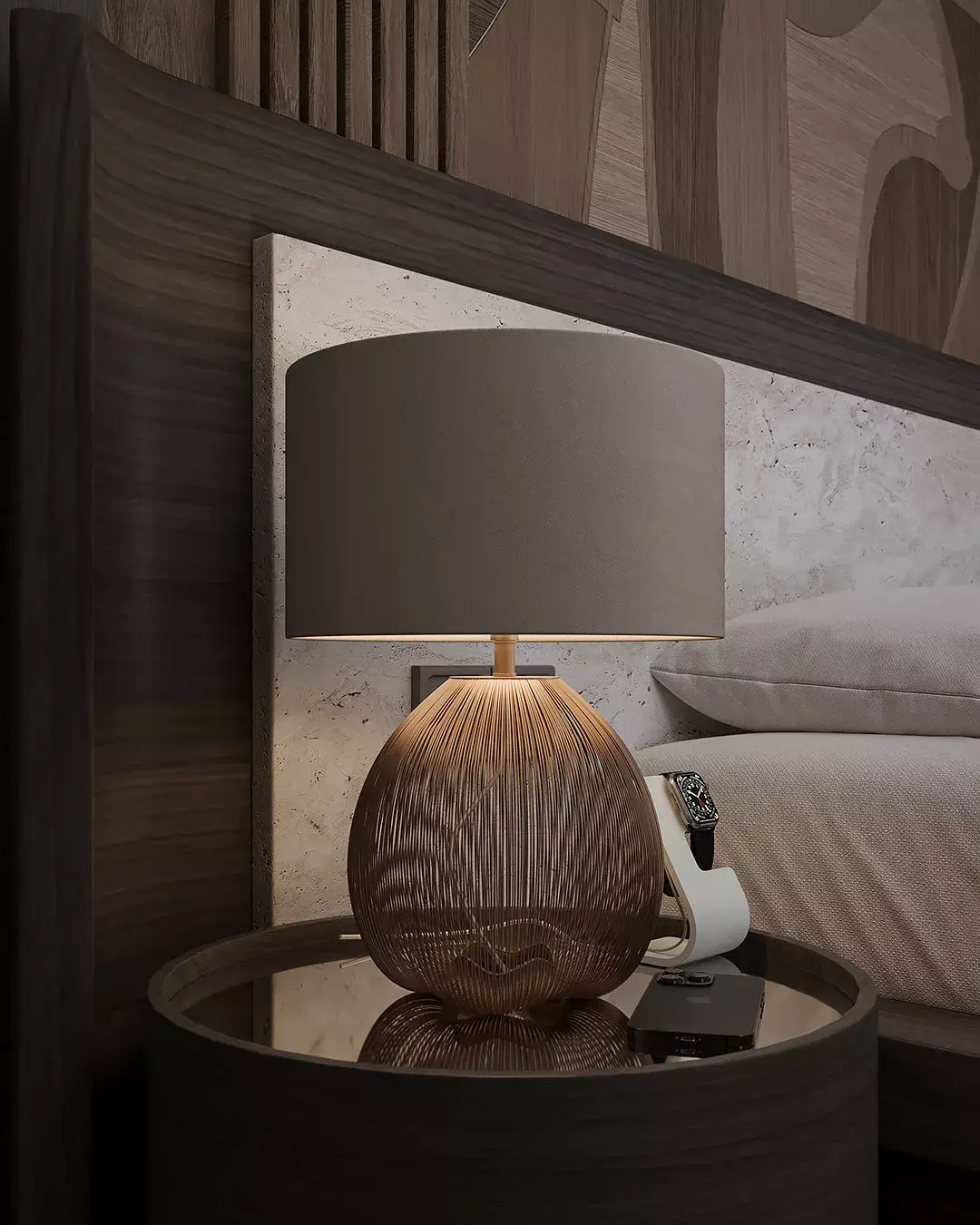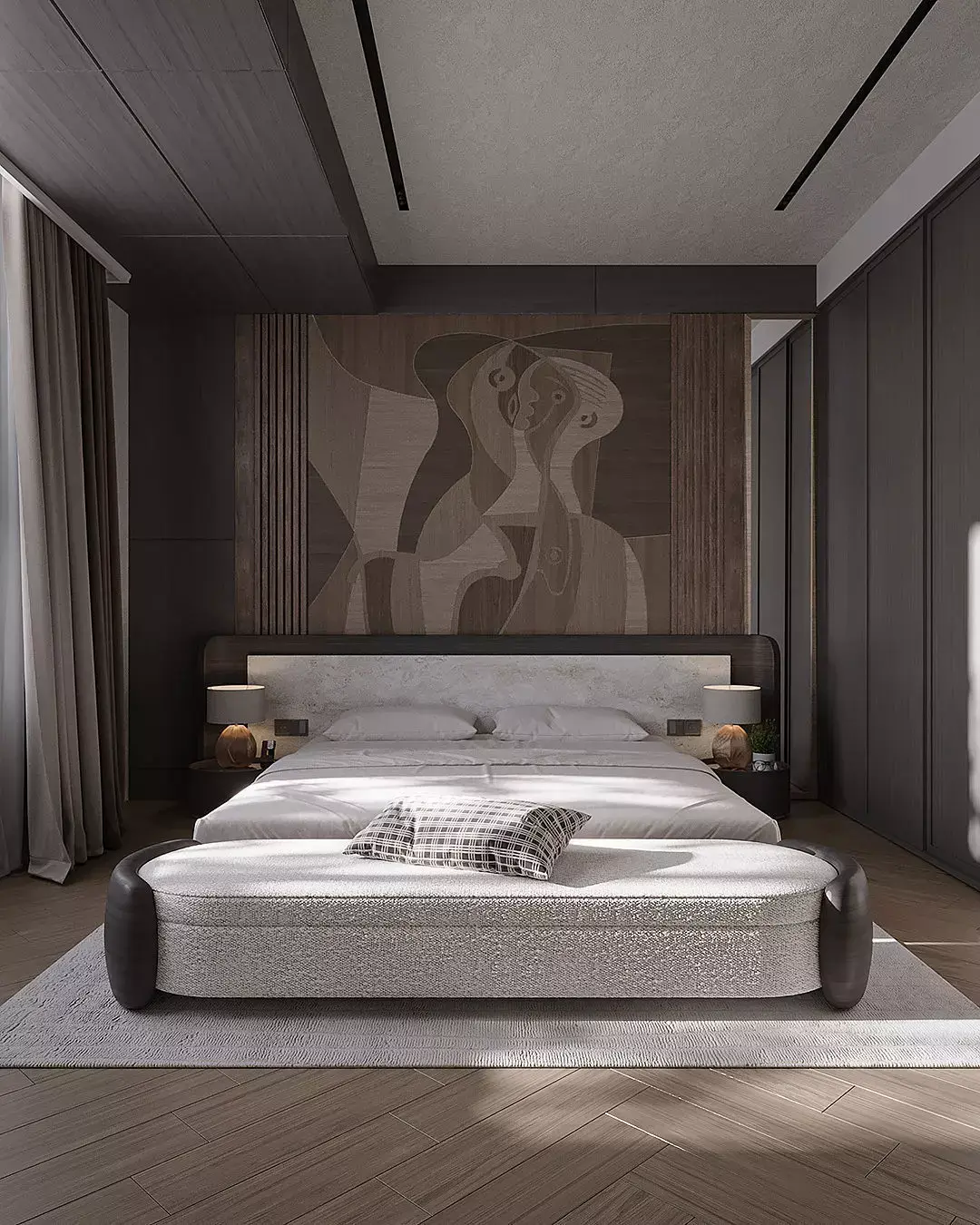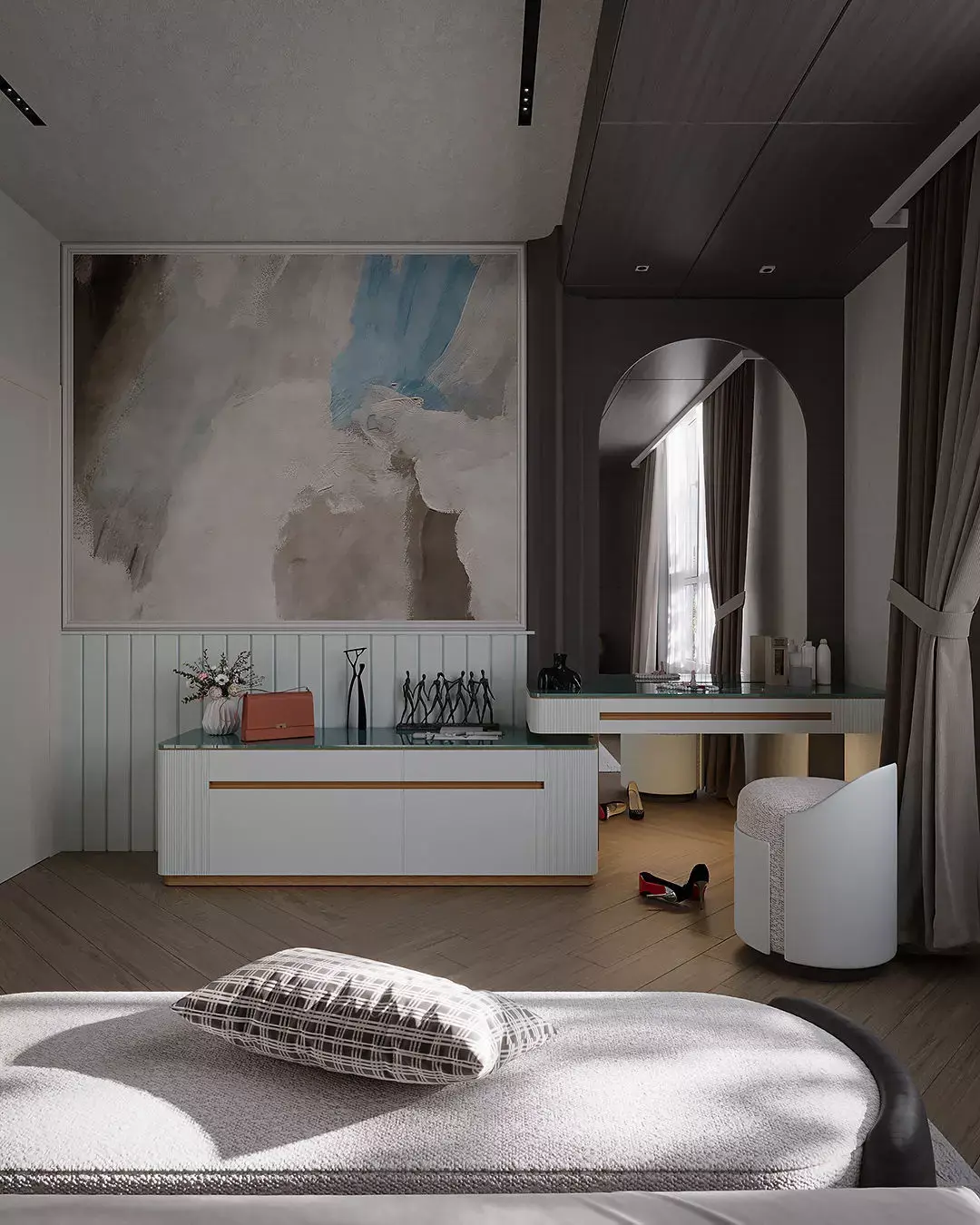 High-Quality Assets: Includes all detailed models seen in the renders: the designer bed, bespoke bench, custom nightstands (comodins), decorative table lamps, abstract paintings, and the full vanity/dressing table area.
