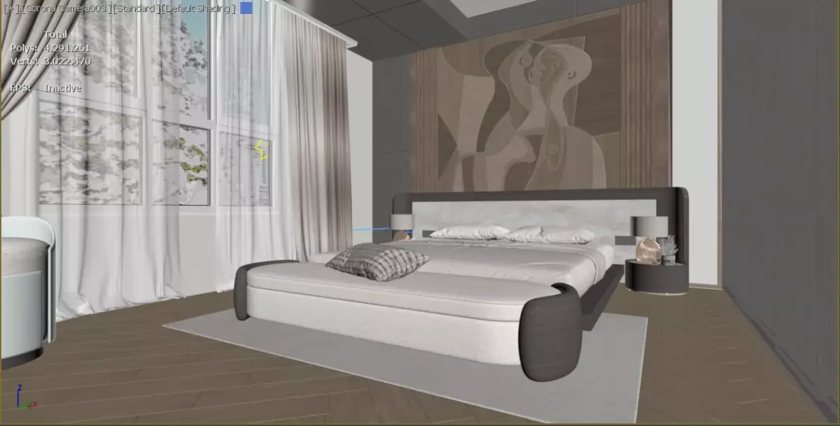 This is a high-end, fully detailed and ready-to-render 3D model of a Contemporary Luxury Master Bedroom Interior Scene. The design features a sophisticated blend of dark wood paneling, marble accents, custom abstract artwork, and soft, natural lighting. The scene is meticulously optimized to deliver the highest quality architectural visualization (archviz) results.eady-to-Render Setup: The 3ds Max file comes with all cameras, lighting, and render settings pre-configured for instant high-quality output.