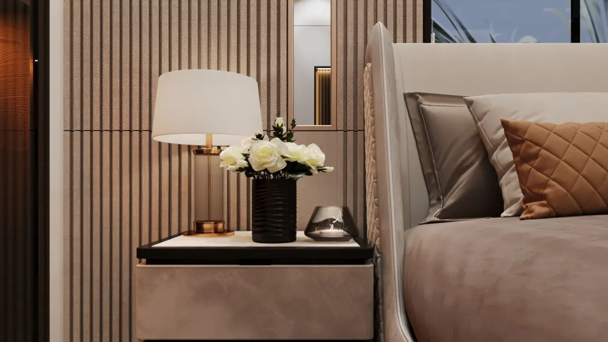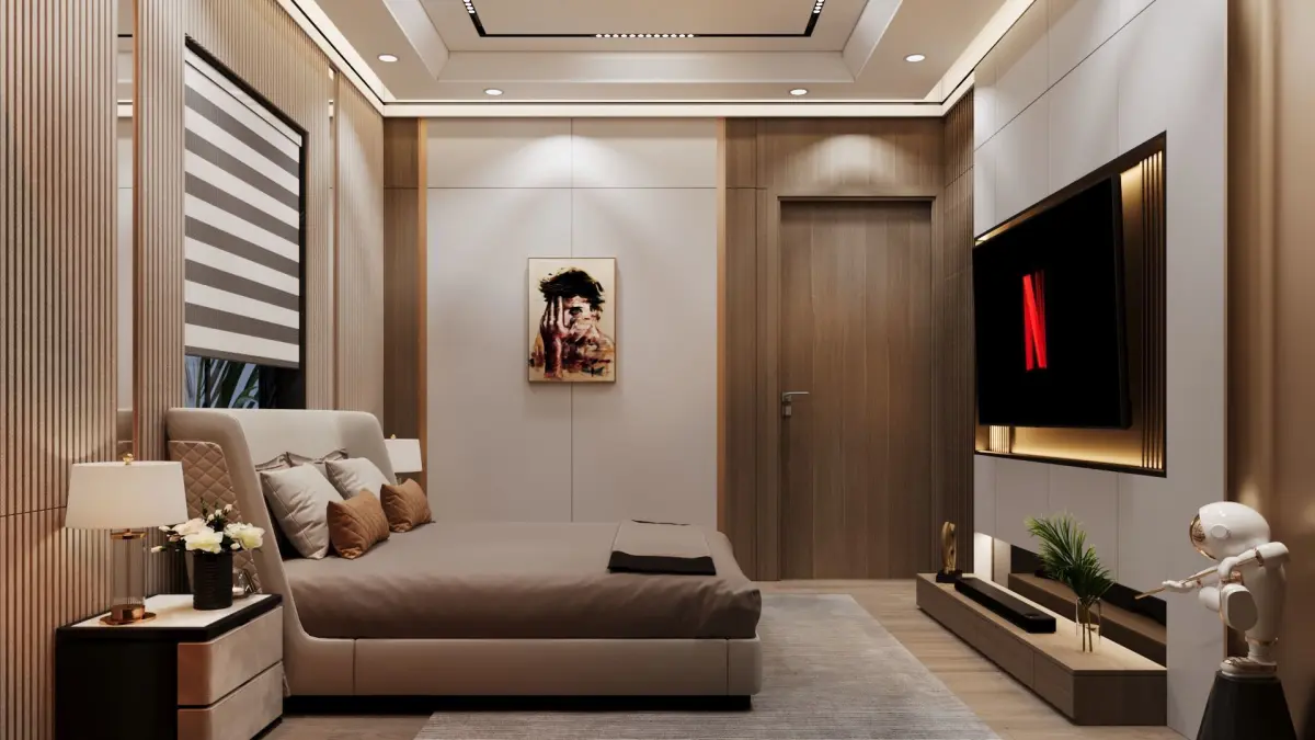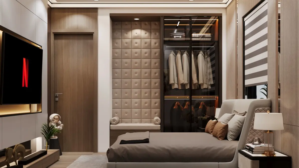 Detailed Elements: Includes high-quality models of a king-size upholstered bed with decorative pillows, bedside tables with lamps, a wall painting, and custom-built-in wardrobes with glass shutters.