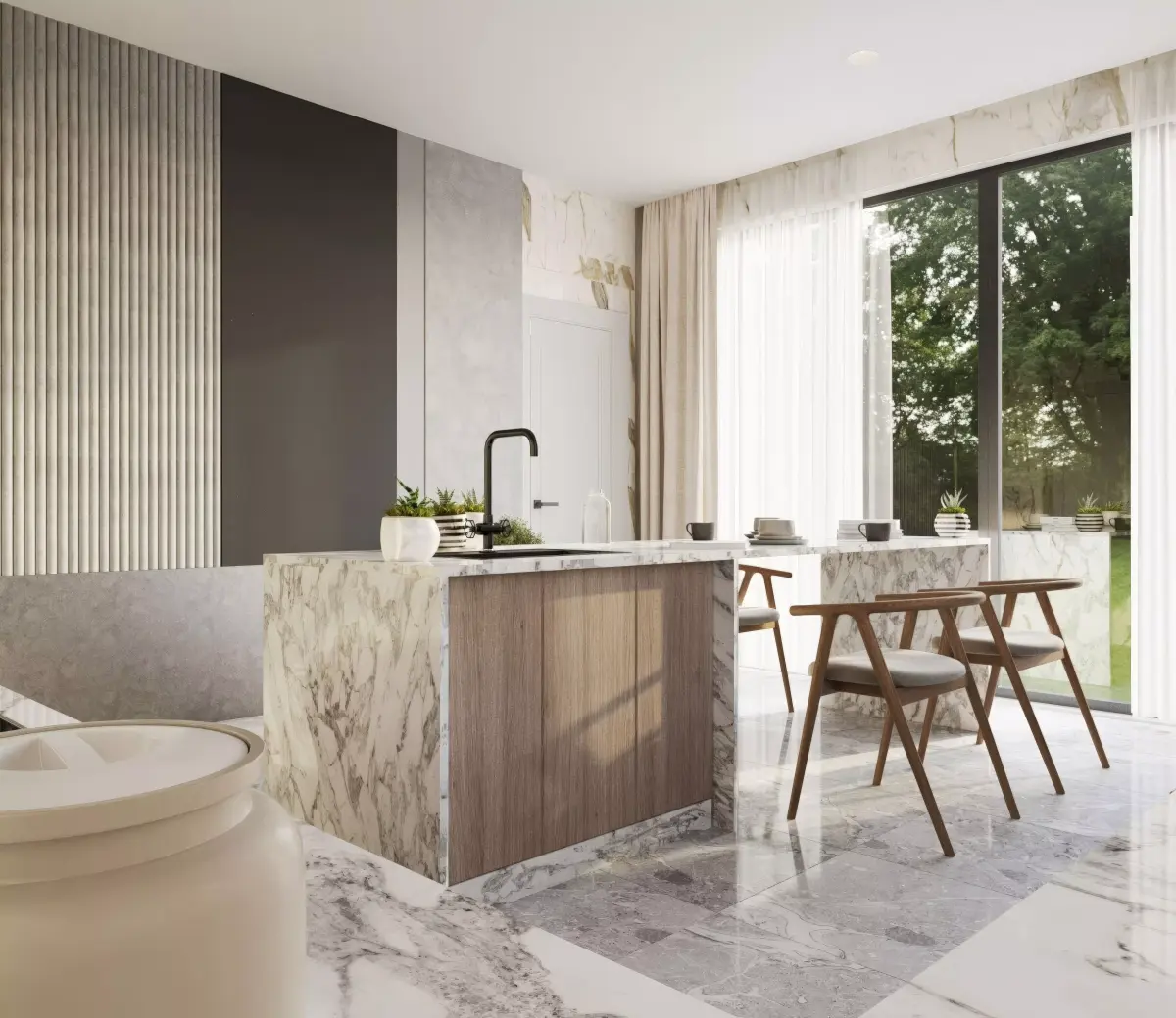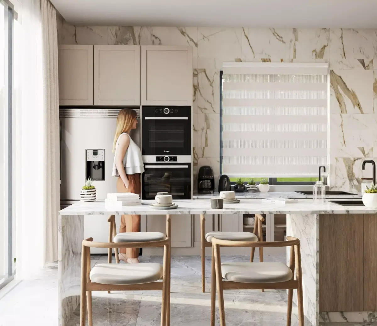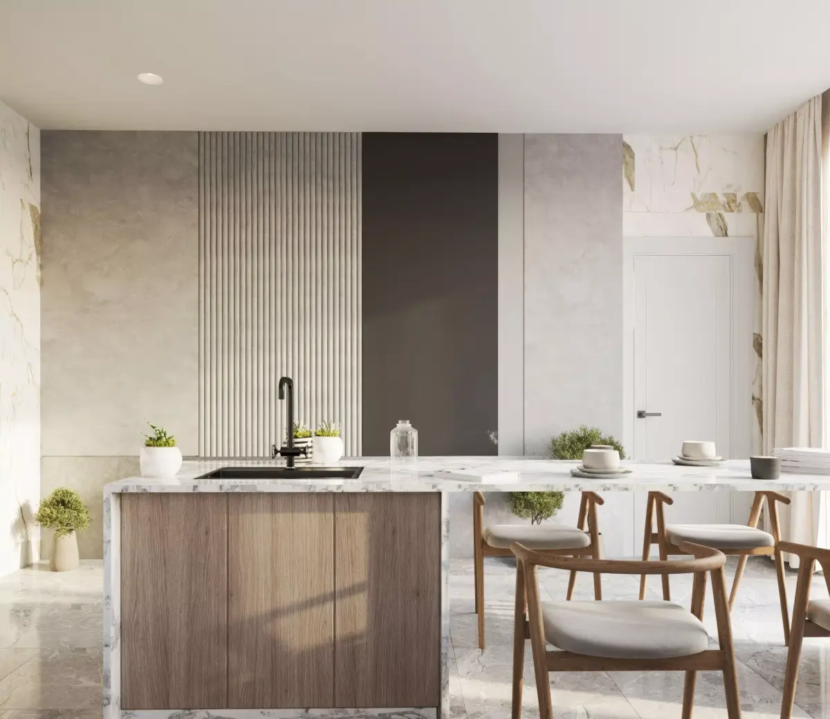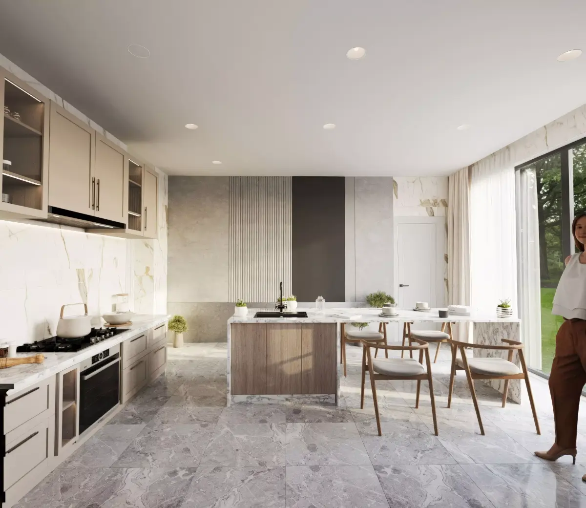 A premium modern luxury kitchen interior designed with minimalist aesthetics. Clean architectural lines, soft neutral tones, natural light flow, and refined materials. Central kitchen island with integrated stove and marble countertop, seamless matte cabinets, built-in appliances, LED under-cabinet lighting, wooden textures, brushed metal fixtures, subtle ambient lighting, large window light source, polished concrete or light wood flooring.Warm and elegant atmosphere, highly realistic materials, professional staging, premium design style.