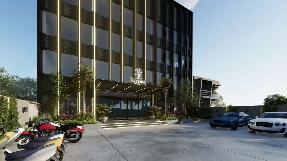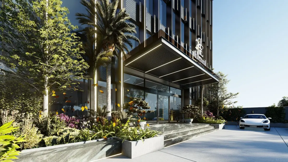 Landscape elements, including trees, grass, and detailed vegetation, were added to Lumion to enhance realism. The scene is set against a serene dusk sky, with ambient lighting, wet pavement reflections, and lifelike materials, making it perfect for architectural presentations, real estate marketing, and high-end commercial projects. The presence of luxury cars and street lighting further elevates the scene's modern urban feel.