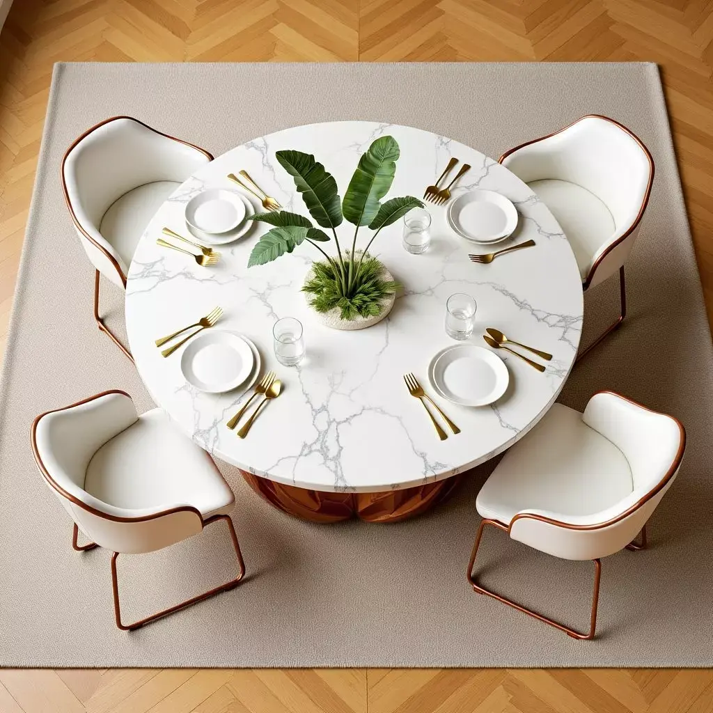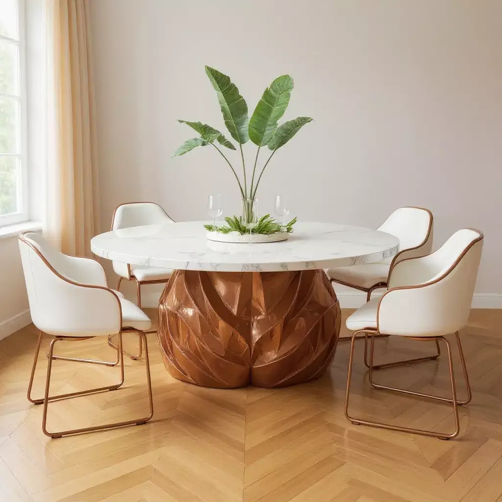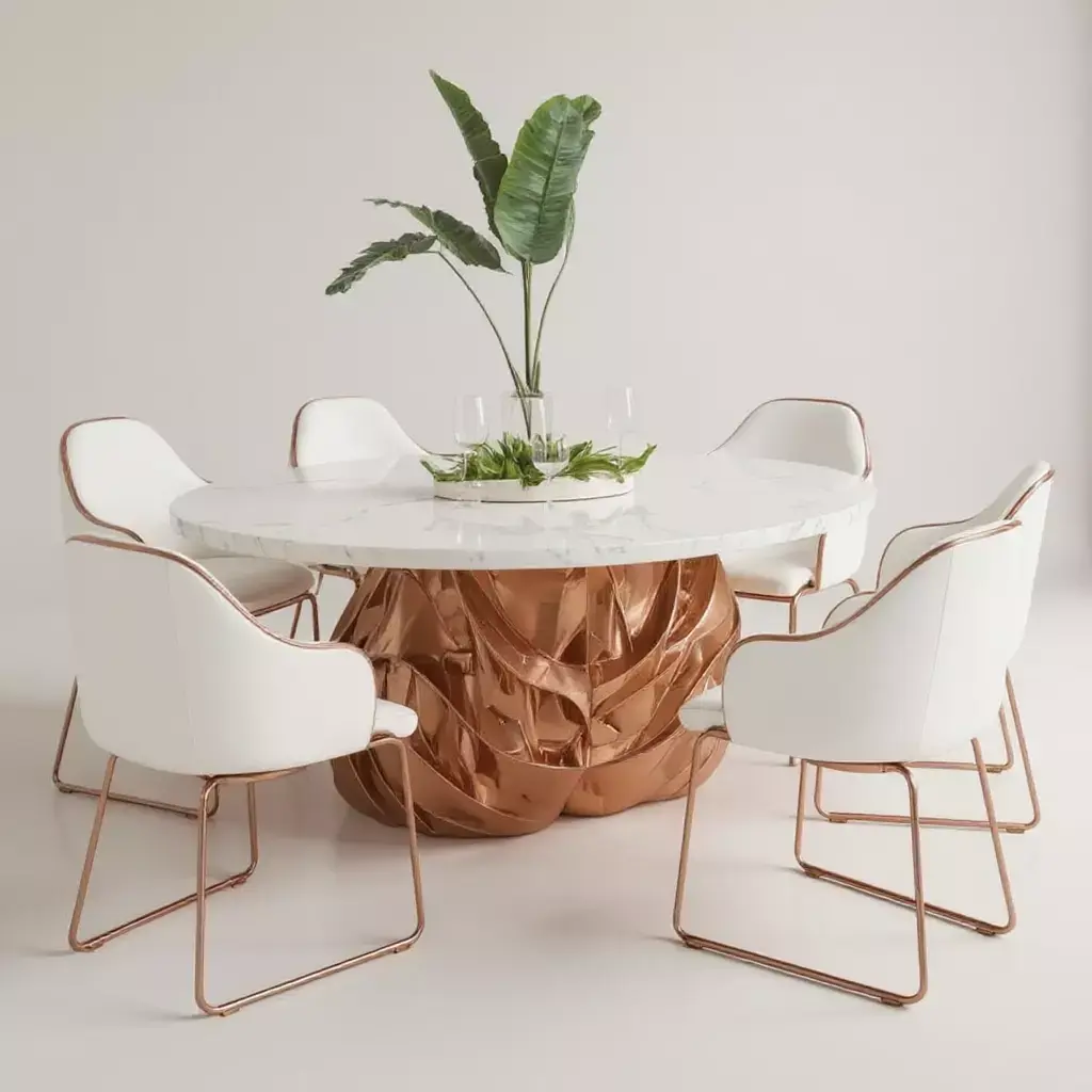 Introducing a stunning fusion of luxury and modern elegance, this Oval Dining Set is the perfect centerpiece for any contemporary home. Featuring a sleek, white marble table top with a luxurious rose gold base, this design combines minimalism with sophistication, creating a space that feels both stylish and inviting. The sculptural base, with its unique wave-like curves, adds a dynamic touch to the overall design, making it not just a functional piece of furniture, but an art statement in itself. The clean, ergonomic chairs are upholstered in premium white leather, offering ultimate comfort while enhancing the overall aesthetic. Ideal for high-end dining spaces, this set brings class and warmth to any room.