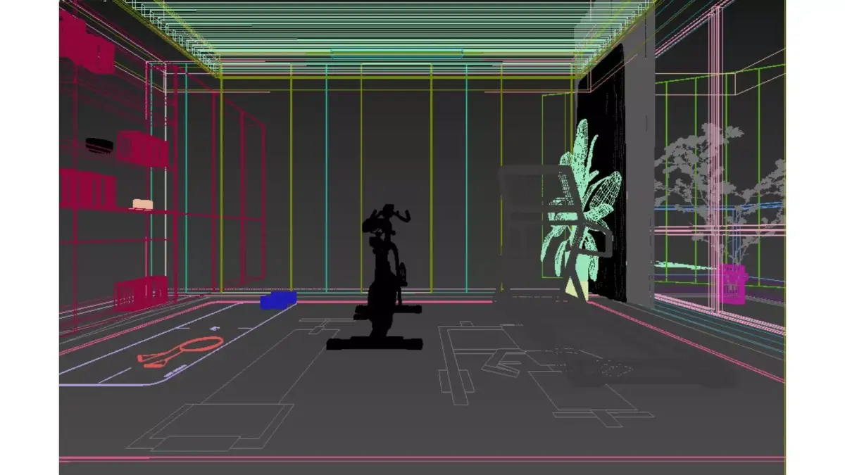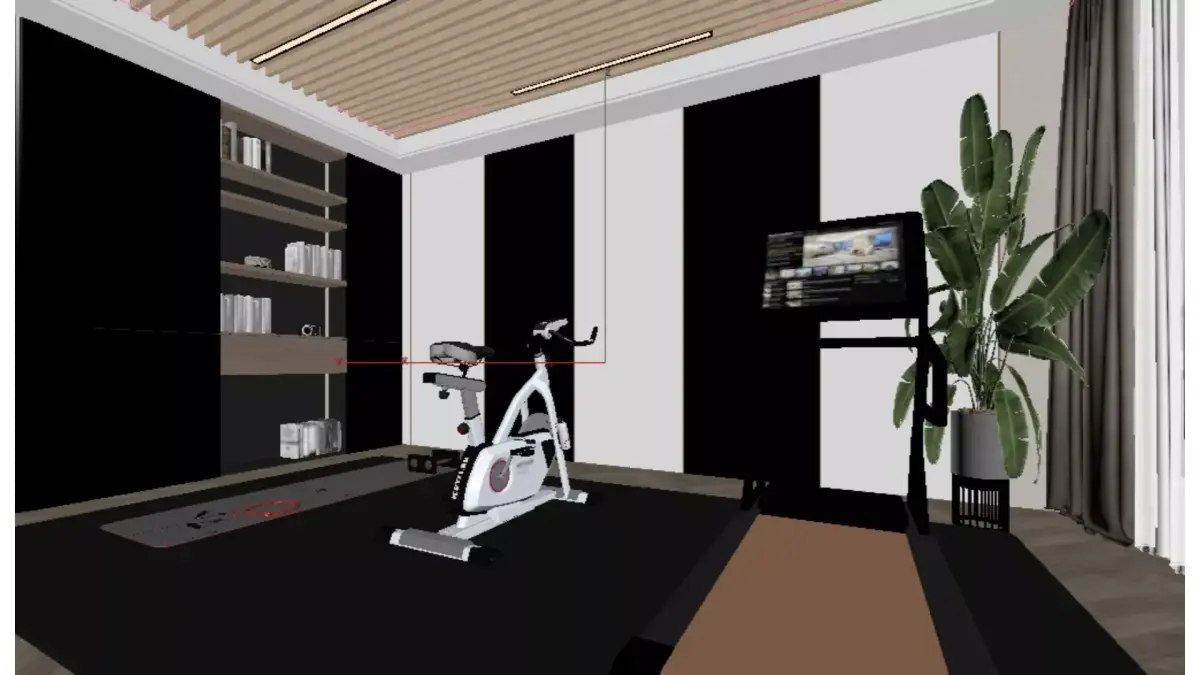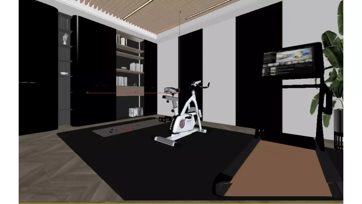 This is a modern luxury style home fitness area, with an overall design that combines functionality and aesthetics:Spatial layout: large french window are used to introduce sufficient natural light and open vision; The ground is made of herringbone wood flooring, with a dark gray professional sports mat laid in the center, dividing it into independent fitness areas.Core facilities: A treadmill, a spinning bike, as well as small training tools such as yoga mats, dumbbells, and elastic bands are placed on the floor mat to meet diverse exercise needs.Storage and Atmosphere: On the left side is a fully embedded storage cabinet, with some open shelves paired with warm light strips, which not only displays books and ornaments, but also stores sports equipment; The ceiling adopts a combination of wooden grilles and linear light strips, creating a warm and modern sense of hierarchy.Soft decoration embellishment: Large green plants are placed by the window, injecting natural vitality into the tough fitness space. The overall color tone is mainly beige and light wood, matched with dark gray and metal details, appearing clean and warm.This space perfectly integrates fitness functions with home aesthetics, making it a private sports world that combines practicality and sophistication.