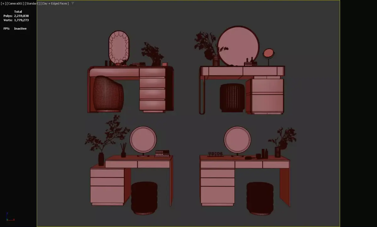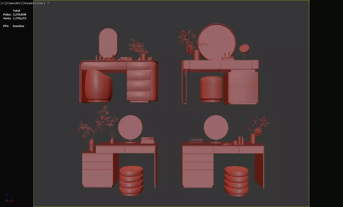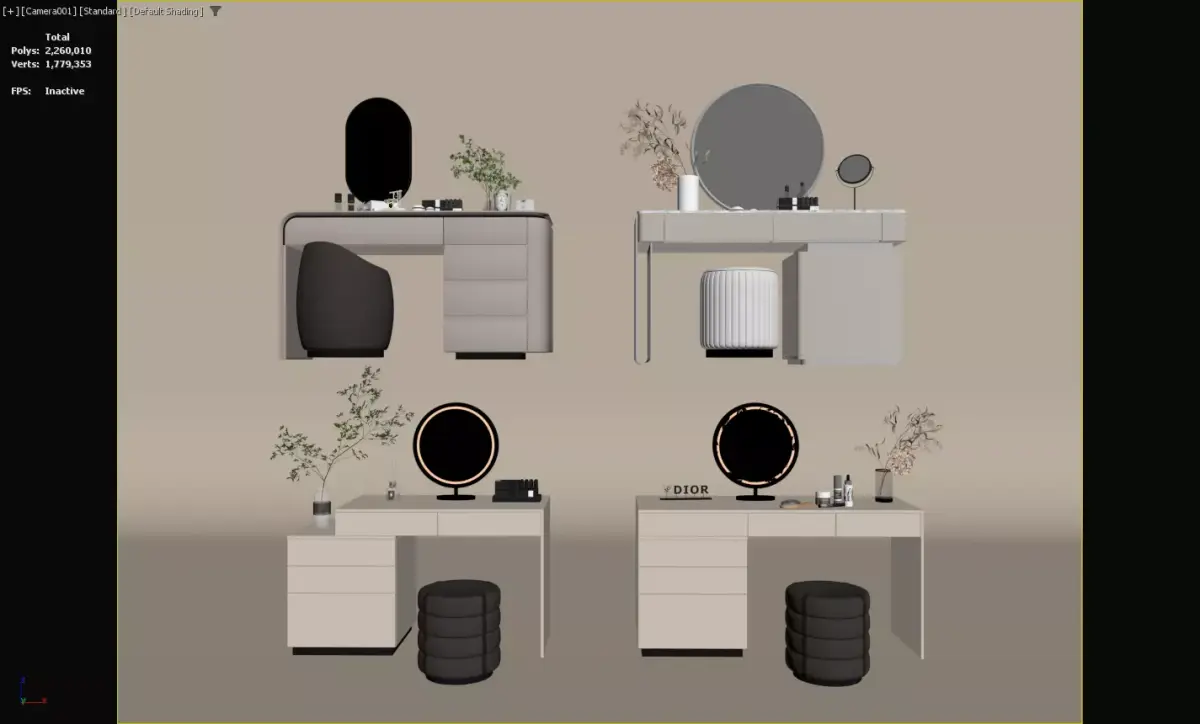 This 3D model collection features multiple modern luxury vanity sets, with key characteristics:Design elements: White + metallic (gold/black) accents, integrated storage (drawers), and varied mirror styles (oval/circular, with backlighting).Materials: Soft velvet stools, sleek lacquered surfaces, and decorative details (cosmetic props, plants) to enhance realism.Optimized for interior design renderings and virtual staging, it suits upscale bedroom or dressing room mockups, blending elegant aesthetics with practical storage for beauty and grooming items.