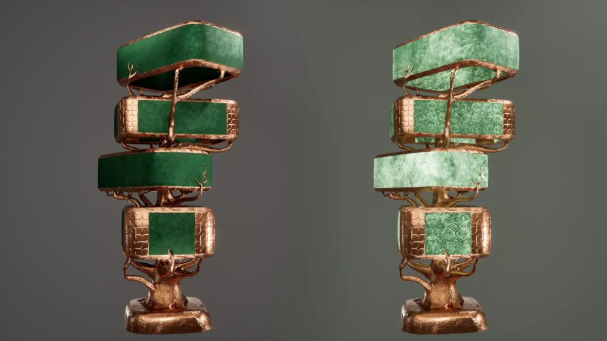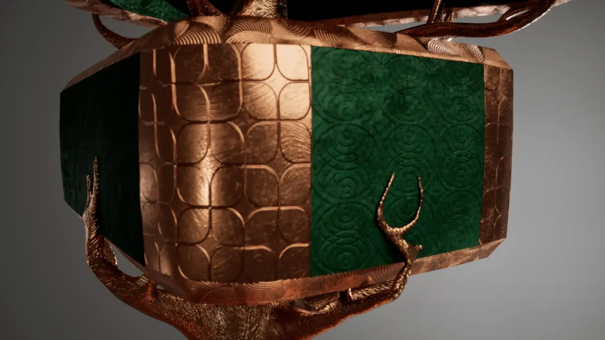 Modern luxurious tree lamp made of green velvet and coper, rendered in Unreal Engine 5.