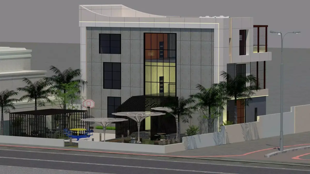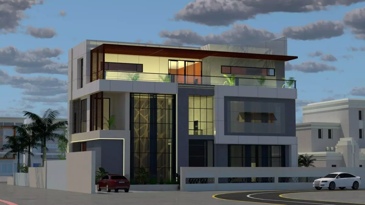 This modern luxury villa project is a three-floor residential design located in Muscat, Oman. The villa combines grey and white paint with elegant wooden pergola structures and tempered glass details, creating a sleek and contemporary aesthetic. The total built area is 1236 sqm, with a clean modern facade and functional architectural layout suitable for 3D visualization, architectural presentations, or client proposals.