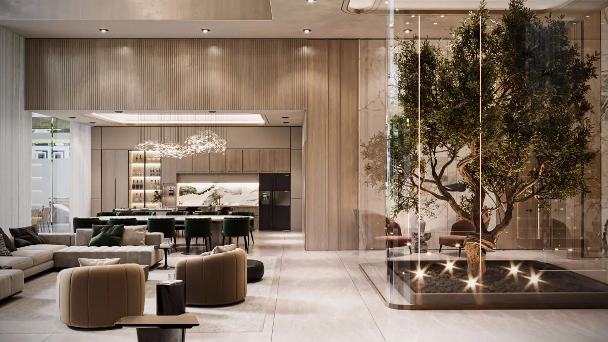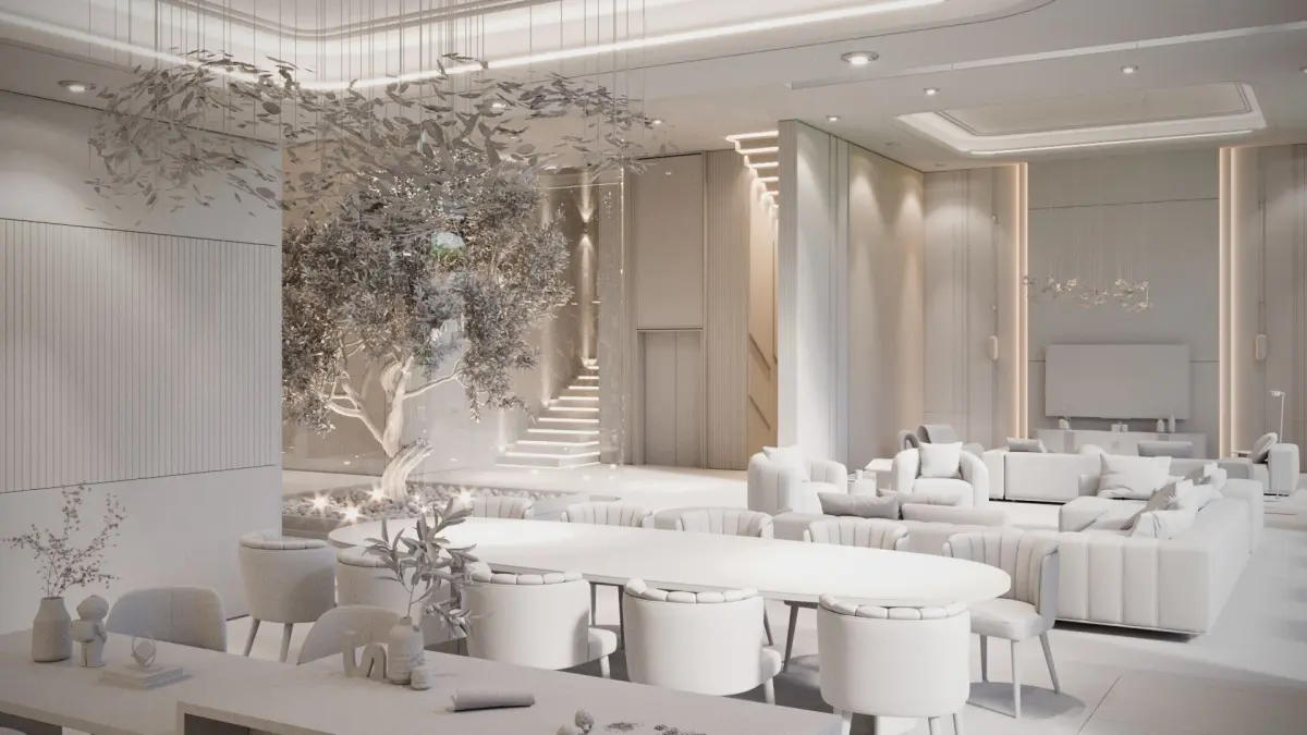 This modern luxury villa interior features a meticulously designed lobby, grand entrance, spacious living area, cozy family seating, an elegant show kitchen, and a sophisticated dining area. The double-height design enhances the sense of openness and grandeur, while professional lighting techniques highlight the high-end details, premium materials, and exquisite craftsmanship. This 3ds Max scene is fully optimized with high-quality textures, realistic materials, and carefully placed lighting to ensure a stunning visual presentation. Ideal for architectural visualization, real estate marketing, and high-end interior design projects.