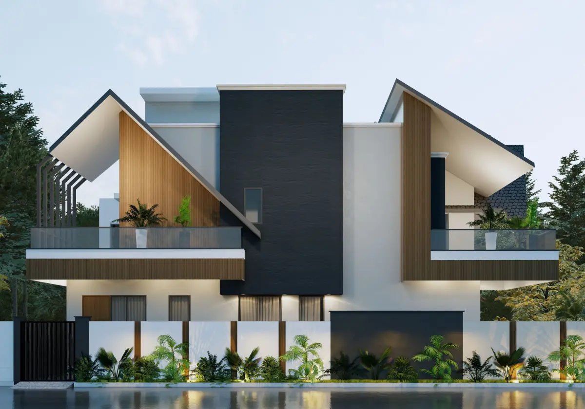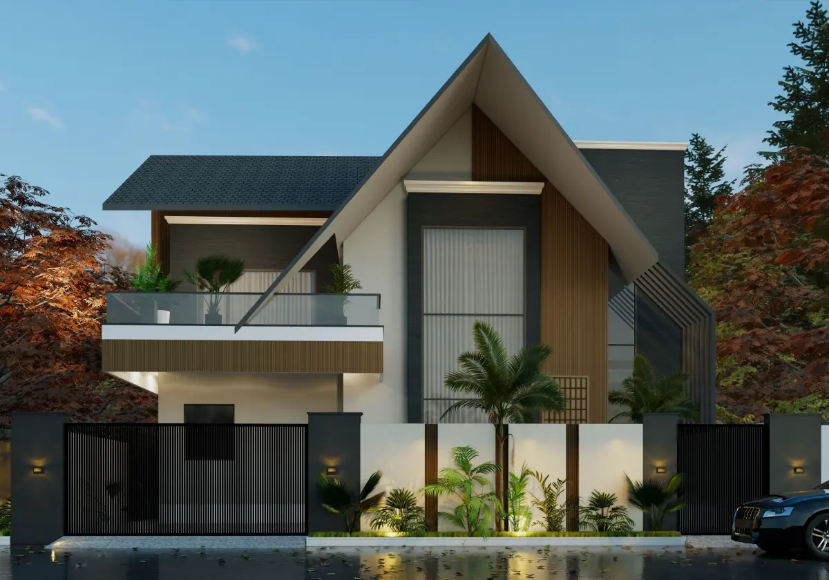 ..High-Quality Exterior Design with realistic textures..Detailed Glass Railings & Wooden Accents..Unique Angular Roof Structure for a modern touch..Lush Greenery & Ambient Lighting for a lifelike feel..Optimized Mesh & PBR Textures for seamless rendering