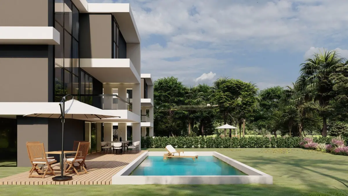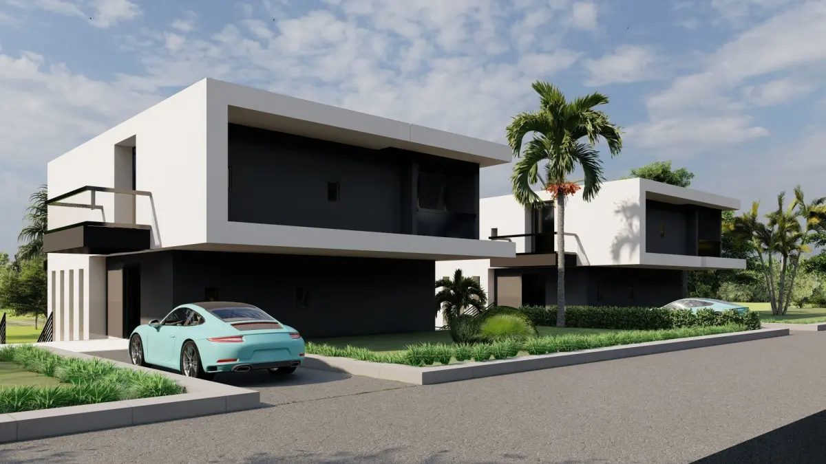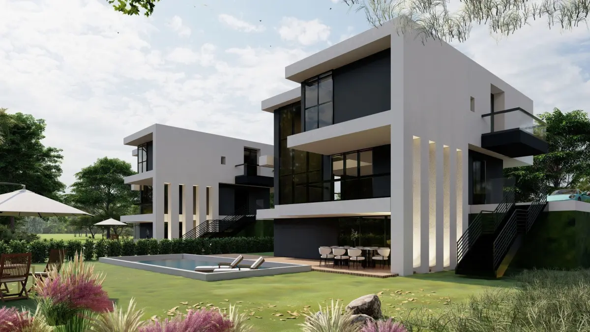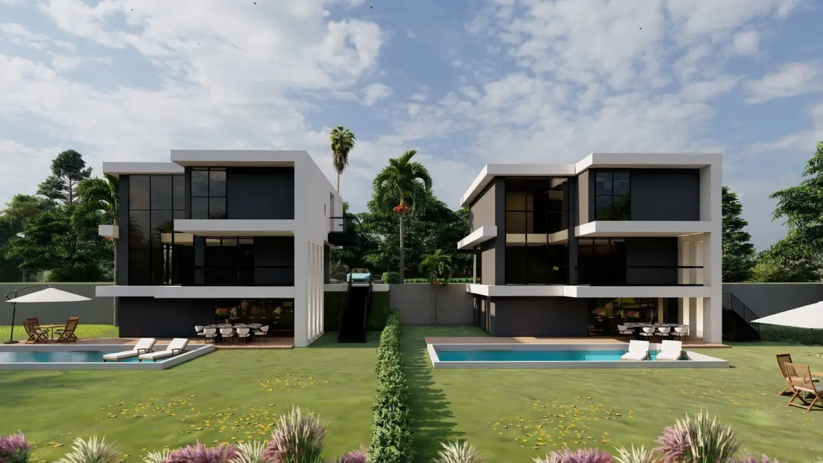 This high-quality 3D model features a modern luxury villa designed with minimalist architectural aesthetics. The model includes detailed representations of two adjacent villas with large windows, clean lines, and spacious terraces. Each villa is complete with a pool, outdoor relaxation areas, and lush landscaping. Perfect for architectural visualization, real estate presentations, and virtual environments. The model is optimized for easy editing and customization, allowing users to adapt the design for various projects. Key features include photorealistic textures, natural lighting effects, and detailed exterior elements like the surrounding garden and poolside furniture. Whether you're an architect, designer, or 3D artist, this villa model is ideal for showcasing modern living at its finest.